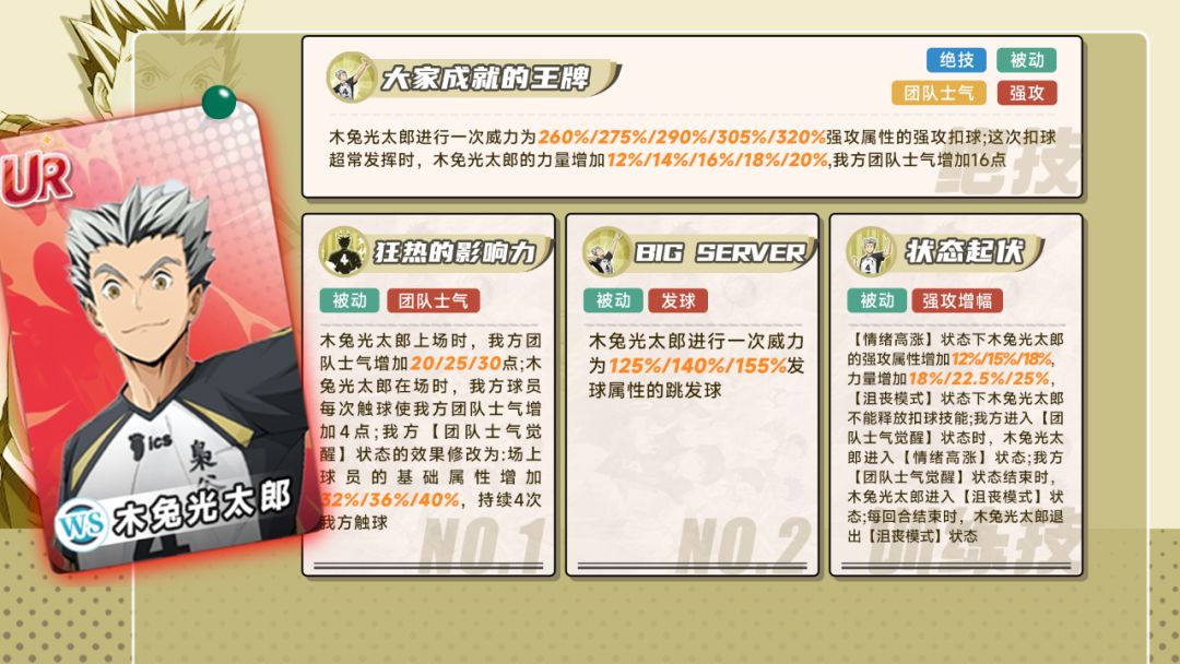 【情绪高涨】状态下木兔光太郎的强攻属性增加12%/15%/18%,力量增加18%/22.5%/27%,【沮丧模式】状态下木兔光太郎不能释放扣球技能;我方进入【团队士气觉醒】状态时,木兔光太郎进入【情绪高涨】状态;我方【团队士气觉醒】状态结束时,木兔光太郎进入【沮丧模式】状态;每回合结束时,木兔光太郎退出【沮丧模式】状态。