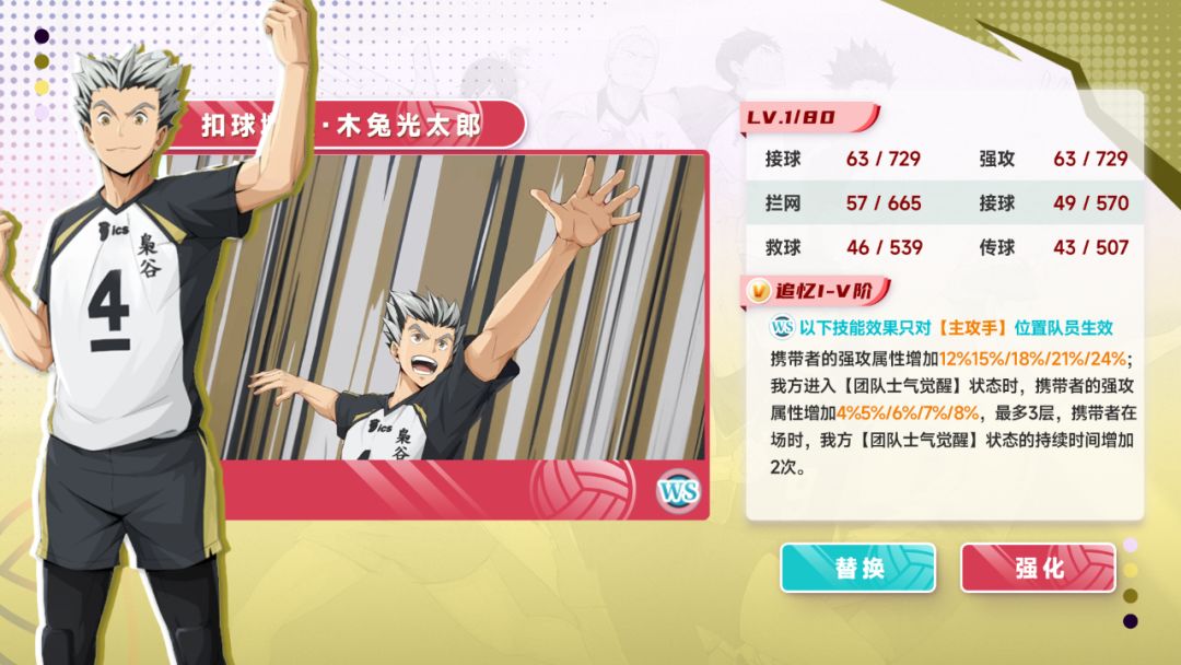 【奇迹王牌和细心二传手】木兔、赤苇的组合技(Lv.5):木兔光太郎退出【沮丧模式】状态;赤苇京治传球,木兔光太郎进行一次威力为325%强攻属性的强攻扣球;这次扣球木兔光太郎的强攻属性增加20%,我方团队士气增加15点。