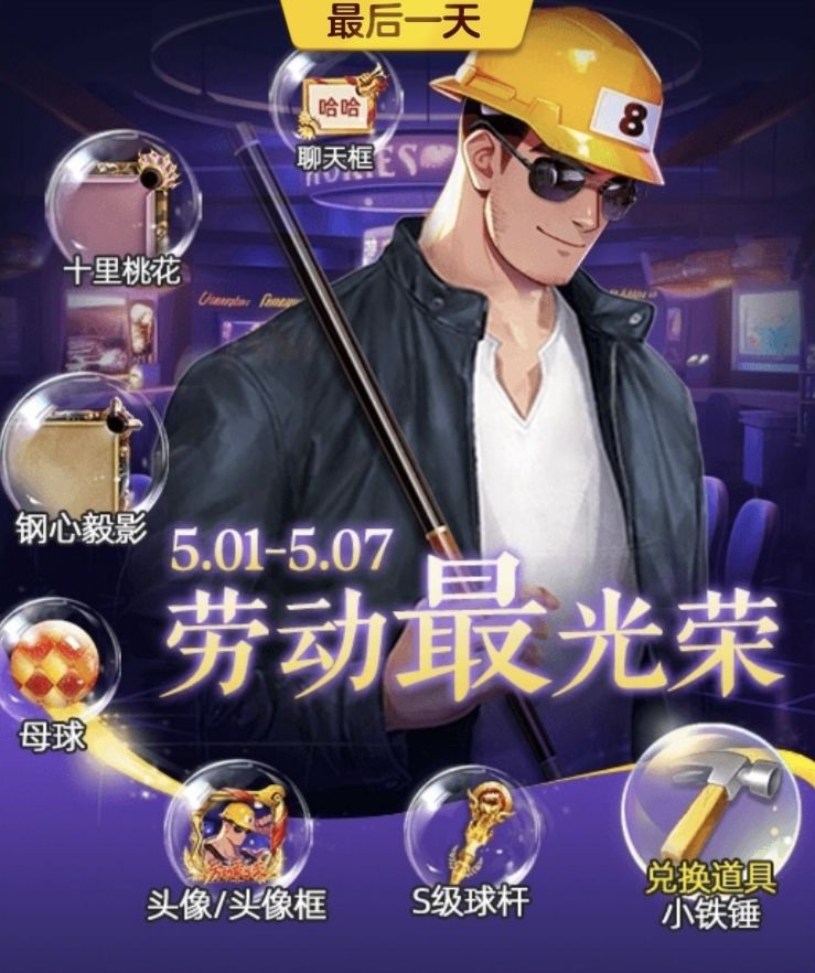 - 小铁锤可兑换各种资源,包括球桌【十里桃花】、【钢心毅影】,S级球杆【劳动光荣】,母球皮肤【坚如磐石】,头像【金刚力士】,头像框【豪勇工匠】,聊天气泡【朝气蓬勃】,及各种材料。