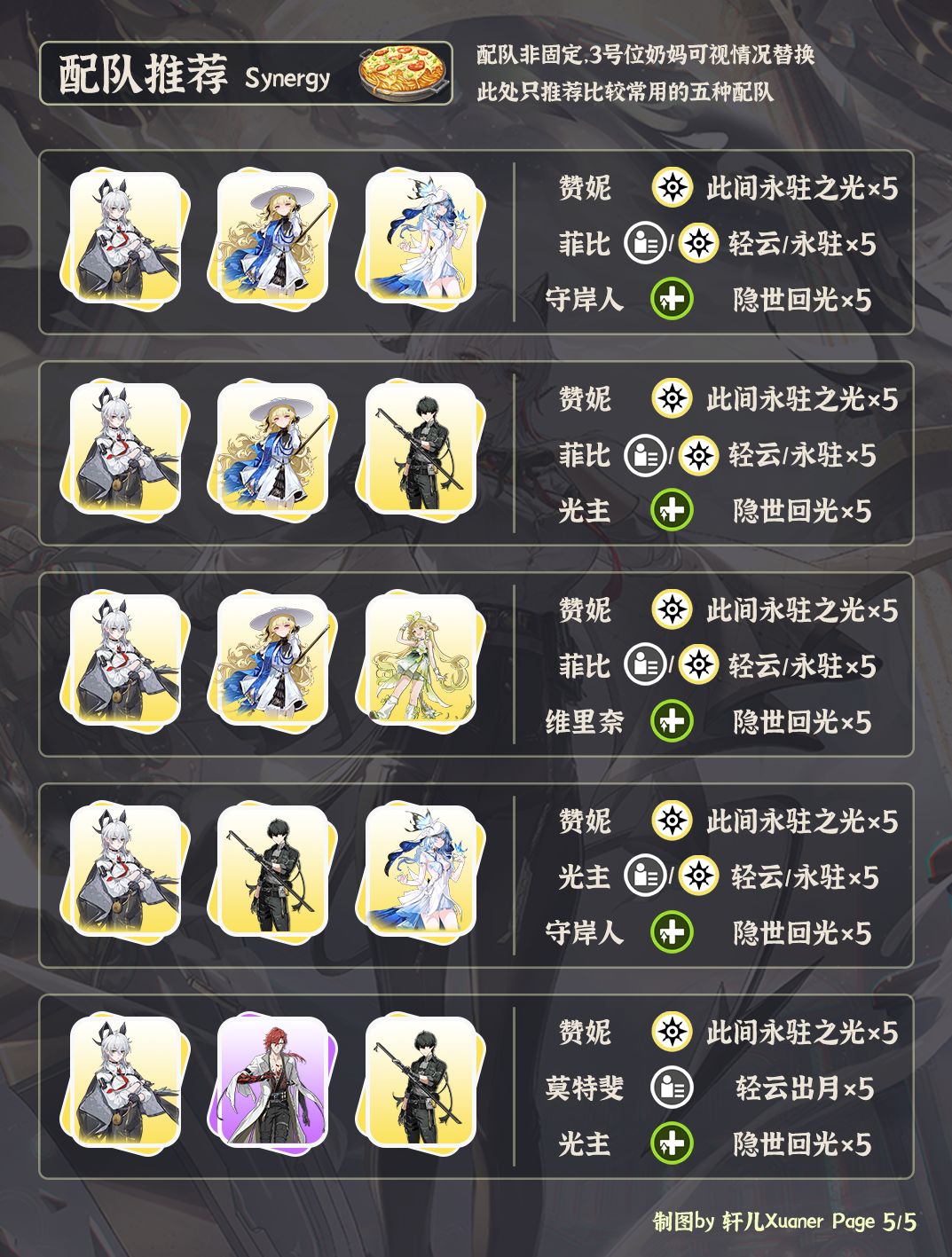 ⑥ 根据赞妮的特性,优先选择菲比作为队友。奶妈位置守岸人或光主优先,如果用光主做奶妈要注意生存压力较大。除菲比以外角色做副C,伤害差距比较大,可考虑光主或莫特斐。