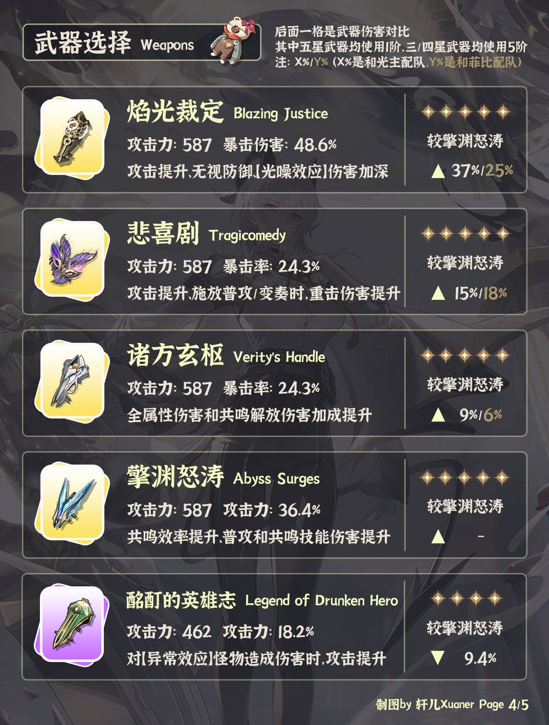 ⑤ 赞妮使用臂铠,首选自己的专武,对比其它武器提升明显。如果有洛可可武器也可以使用,吃重击伤害加成。四星武器推荐酩酊的英雄志。
