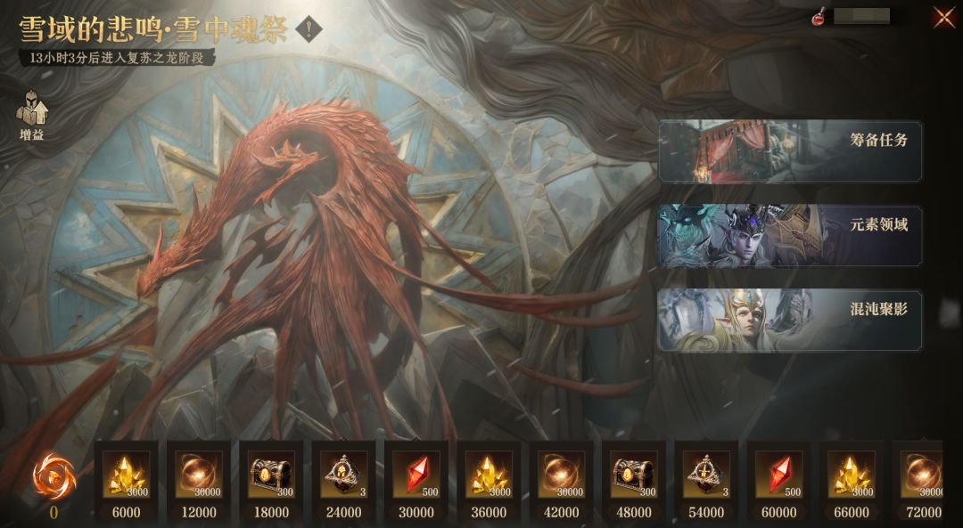 雪中魂祭:参与筹备任务,消耗龙芽汤剂挑战元素领域、混沌聚影→获取探索度和亲和溶剂→解锁探索度档位奖励