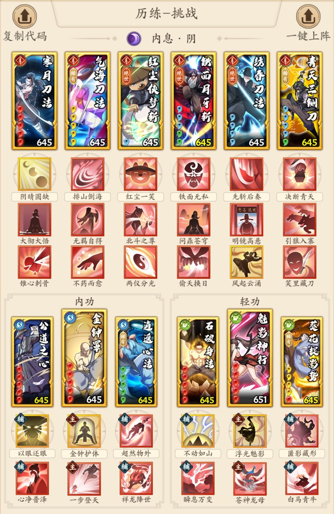 前期一直心愿绣春就行 铁面高人心愿铁面 黄一转红尘 有人说阴刀太贵 事实上阴刀并不太吃外功勾 寒月满红就能发挥效果 优先拉轻内提高基础属性 稀有绝世外功有条件再拉