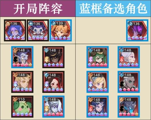 黑框角色为较为固定角色,蓝框角色为可替换角色,蓝框不一定就弱,只是不同情况下的选择不同而己。