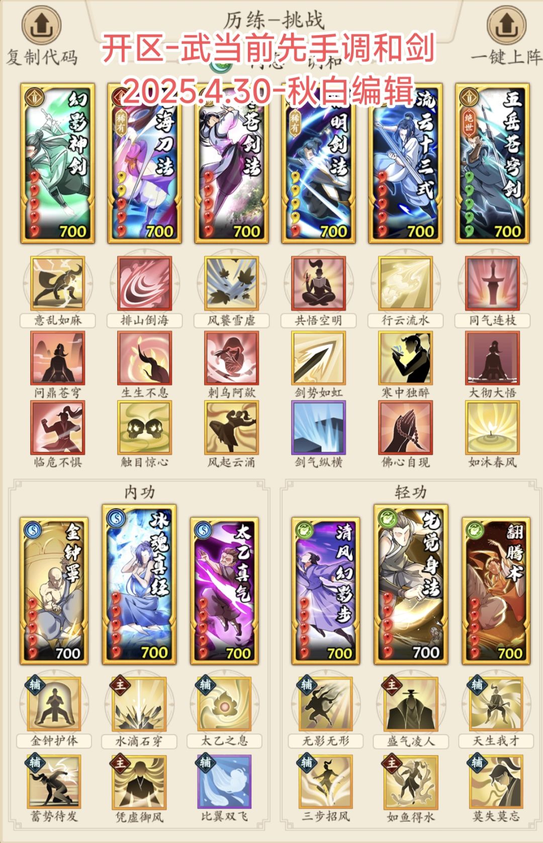 搭配如下:这阶段不单独配备后出手搭配了,没先手的玩家 自行更换一下主运内功为云体风身术(后出手情况下前三回合50%解除身上一个控制)去赌脸即可。