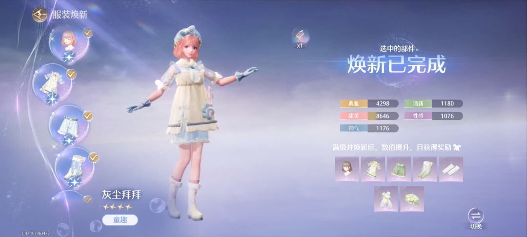 推荐配置灰尘拜拜套为基底,换:随意外套,随意饰品3个。套装焕新。祝福闪光:玫爱头手脚。