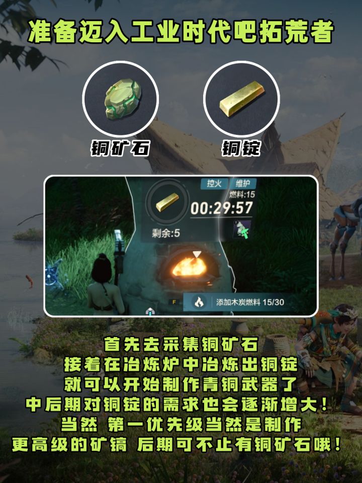 还在用普通的石头?是时候迈入新时代,迎接金属武器了。需要你去采集铜矿石,接着在冶炼炉中冶炼出铜锭就可以开始制作青铜武器了,中后期对铜锭的需求也会逐渐增大!!