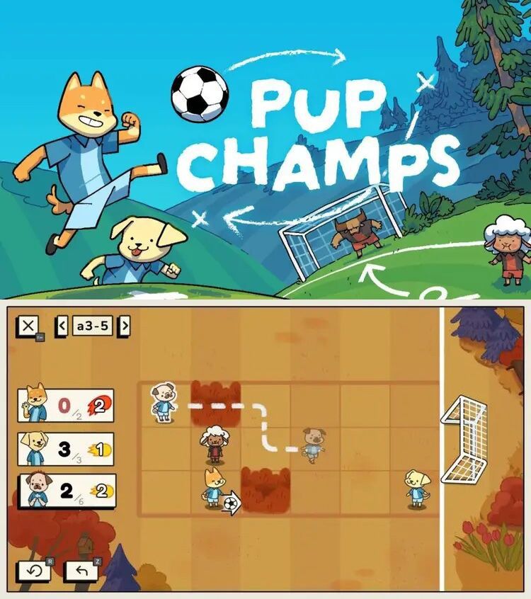 由轨道连接团队创作的足球解谜游戏(可以看出他们很喜欢狗狗),以推箱子+足球团队协作的方式让小狗们把球射 击龙门。