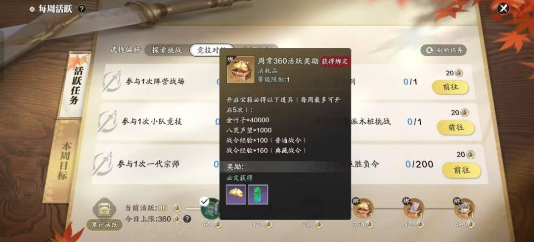 更新之前把360活跃度的奖励拿到手,周活跃度奖励将在更新后重置领取次数,这样大家就可以在更新后可再领取1次奖励。
