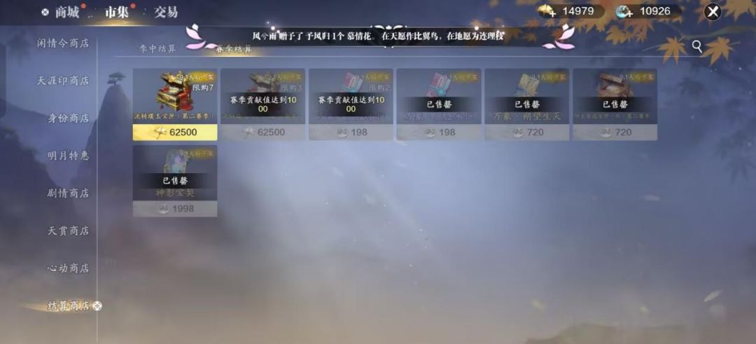 赛季商店开放购买的物品包含流转璞玉宝匣(第二赛季)、万象·盈虚永恒、万象·朔望生灭、阳玉自选宝匣·叁(第二赛季)以及神影宝契。需要重点留意的是,神影宝契售价为 1998 月灵石,这属于必买好物,因为它能够直接用于兑换下期神池问影外观。