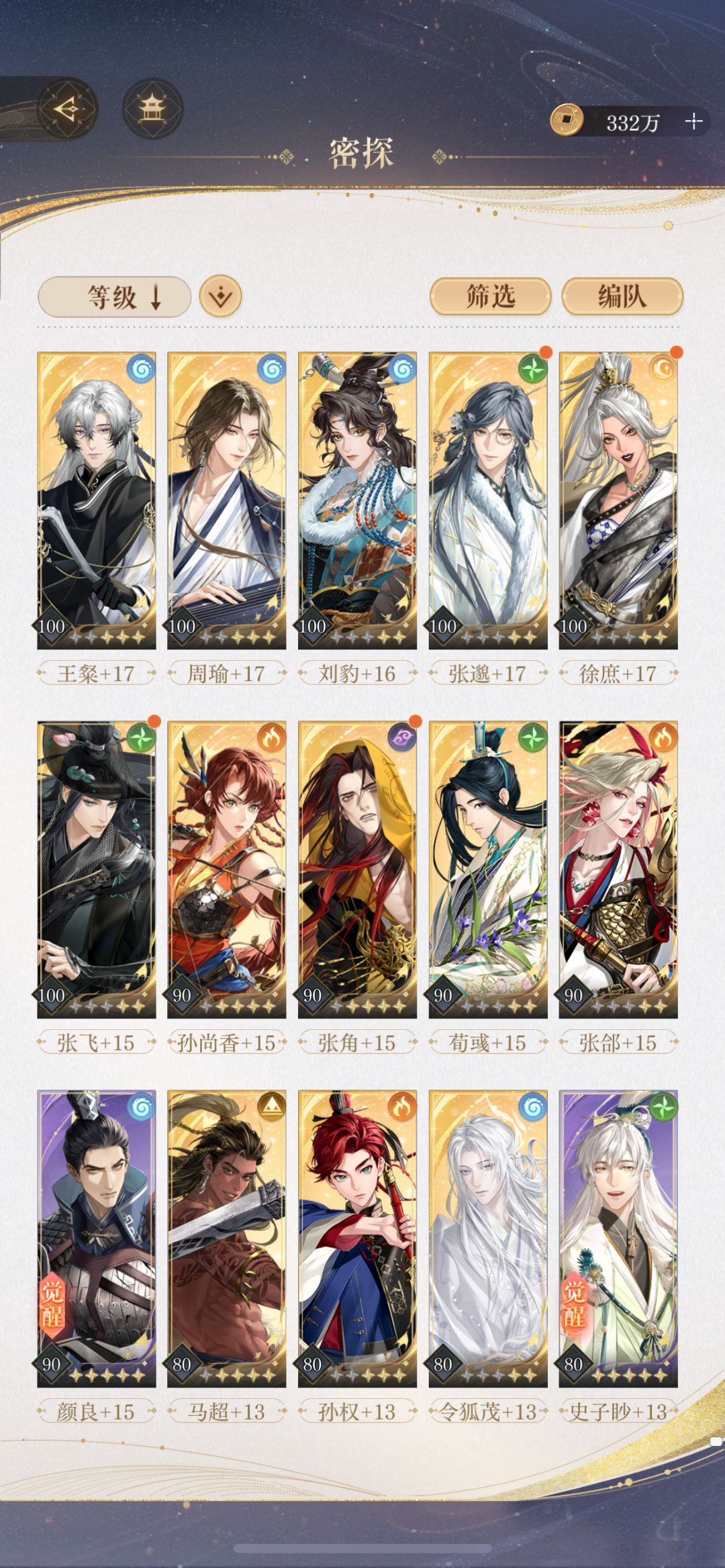 命盘:周瑜琴式盘/刘豹大漠盘/王粲受伤盘/张邈无晴盘/张飞死战+断桥+普攻中幅/徐庶谋无+敌少+攻击中幅/陈登能量+3