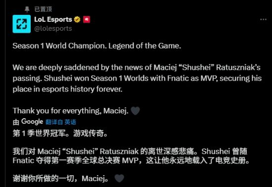 《英雄联盟》官方也发文缅怀了这位传奇选手:S1世界冠军,游戏的传奇。我们对Maciej “Shushei”Ratuszniak的离世深感悲痛。他曾以MVP的身份帮助Fnatic夺得S1全球总决赛冠军,他将永远在电子竞技历史上占有一席之地。