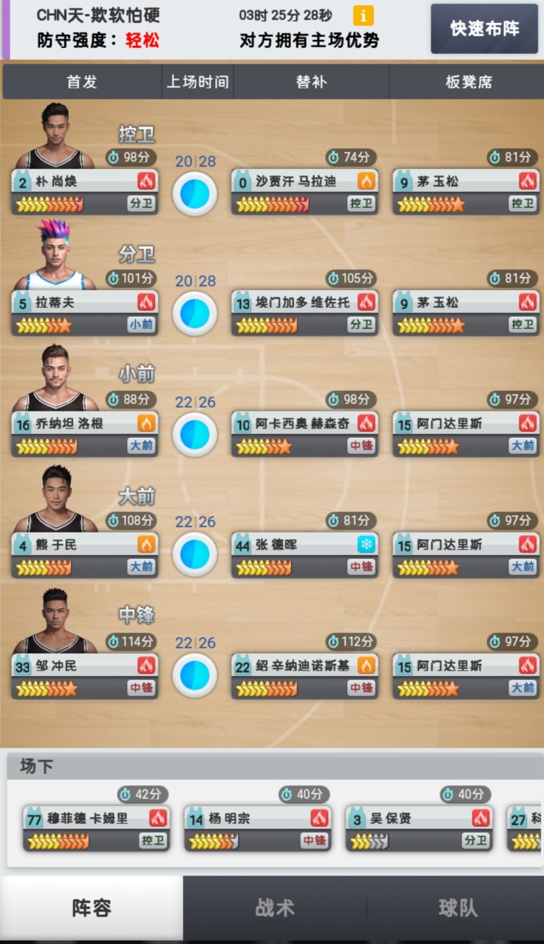 - 外线进攻战术:主打远距离两分、三分、突破尝试。如果有擅长外线进攻的球员,可适当增加其上场时间,让他们充分发挥得分能力。比如,拥有三二突球员(外攻以3分、2分和突破为主),在这种战术下,可根据其体力和状态,给予比其他球员稍多的上场时间。