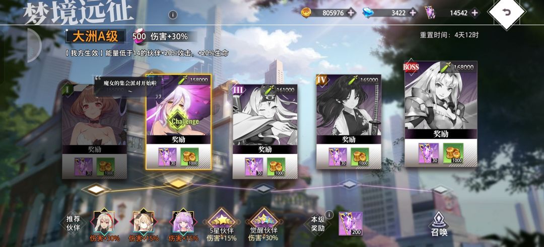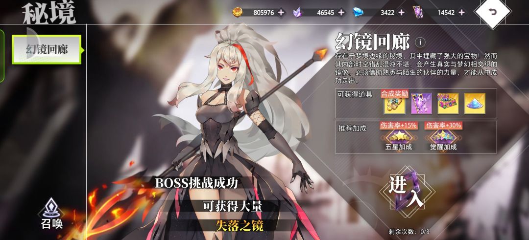 - 幻境回廊:尽量不遗漏挑战次数,可获角色碎片。优先选聚魂阵营,其队长技能可开启无敌效果。buff优先选增伤类型,其次选生存辅助类型。
