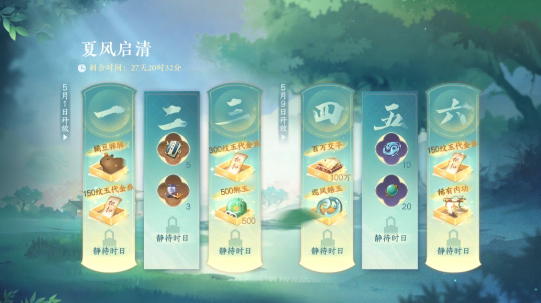 明日(5月1日),夏风启清签到活动开启,登录可领坐骑:橘豆豚豚、150纹玉代金券。后续还有300纹玉限时代金券、150纹玉代金券、百万交子、自选优稀有内功等等好礼。