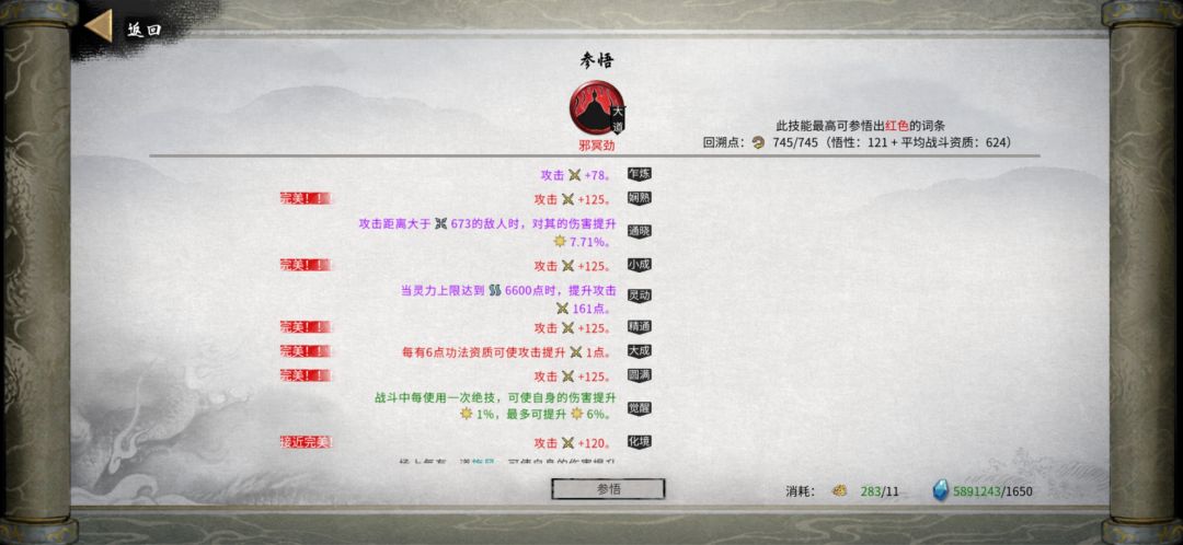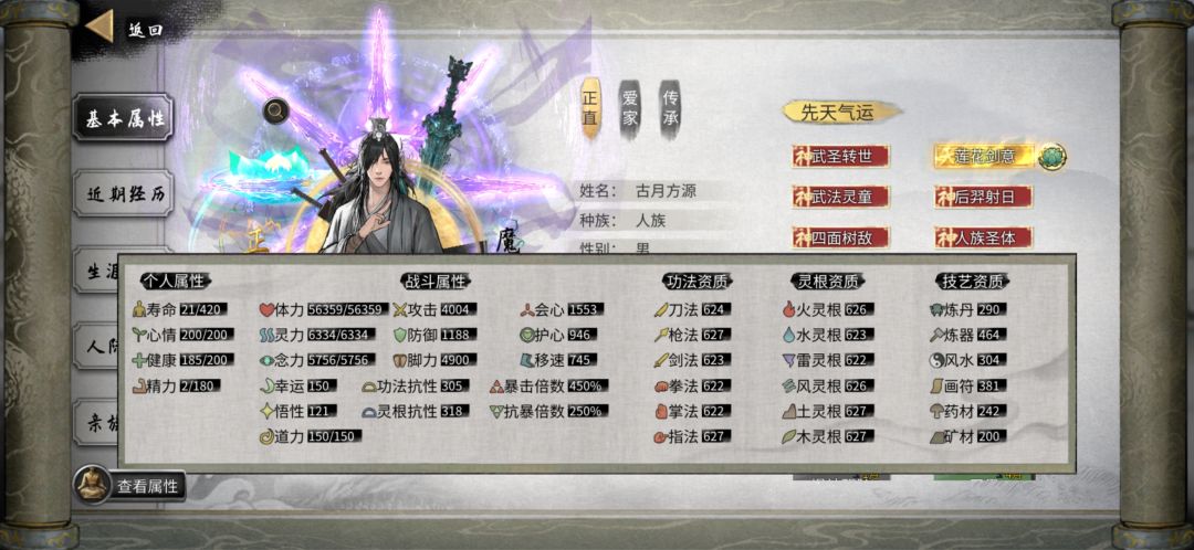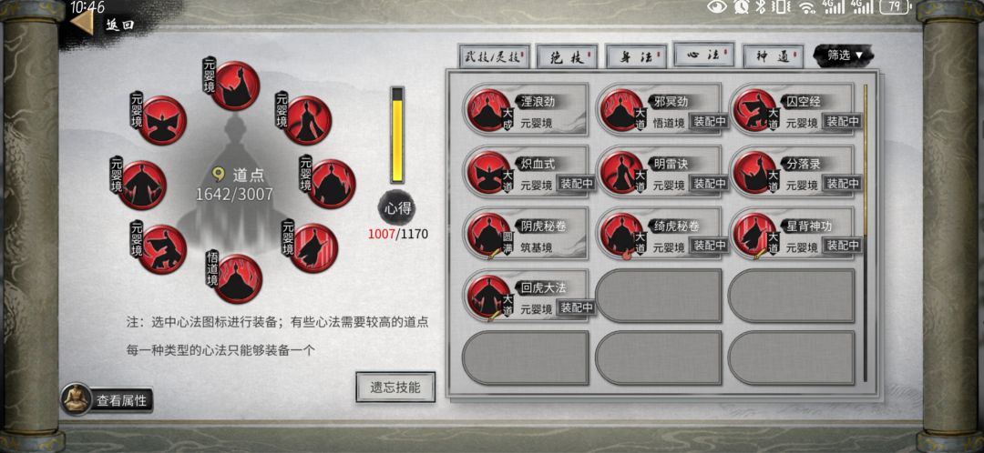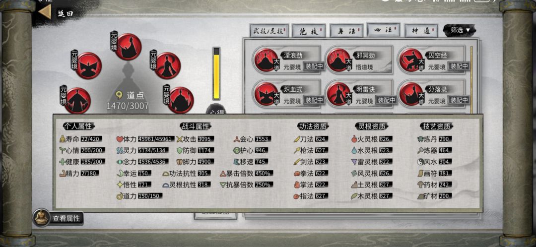 功法很常规,基本都是元婴。只有劲是拜了悟道师傅,不然面板太缺。一本悟道劲可以给近1000攻,运气好可以更多,但是没必要强求。也推荐各种流派都搞一搞,不管什么流派,跨境界拜师学劲,洪荒过渡很轻松。