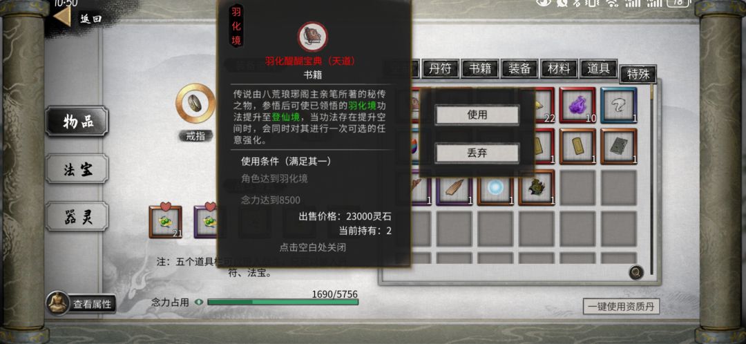 一周目普通火剑没什么感觉,而且也踩了不少坑。所以二周目选择洪荒难度,还是玩火剑,弥补一下不足,比如太古残卷,一周目到了登仙才知道怎么做,以至于普通档只有一个宗门逆天杀心骤起。