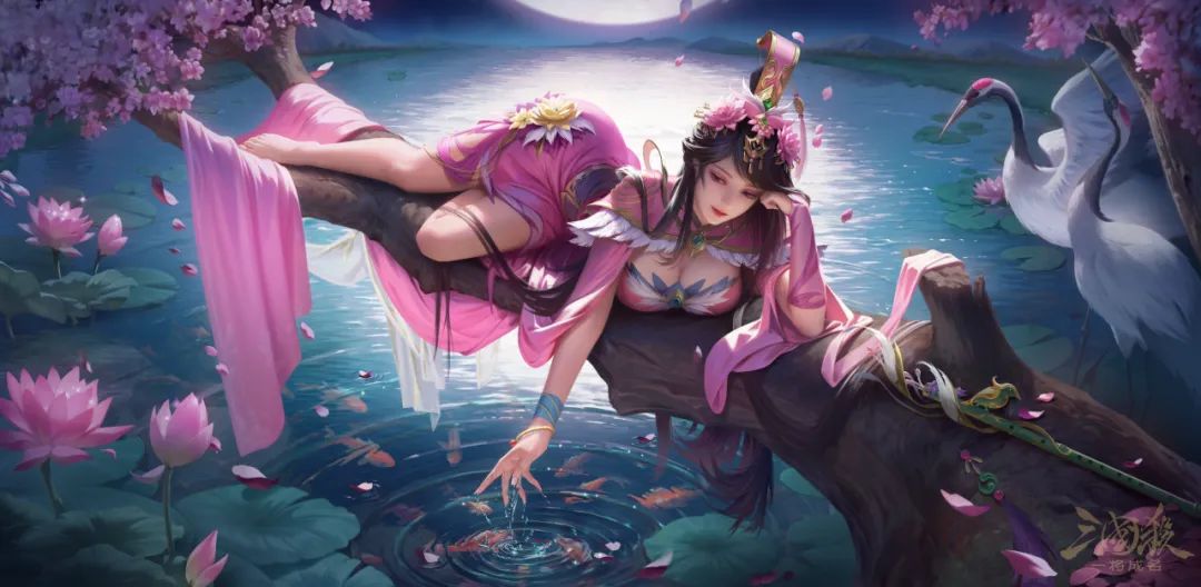 美人慵懒地伏在樱树枝干上,青丝如瀑垂落。几缕发丝被夜风逗弄,轻轻拂过她如玉的颊边。纤手轻触水面,漾起一圈圈细腻的涟漪,惊醒了沉睡的水镜,也搅乱了他人的心。
