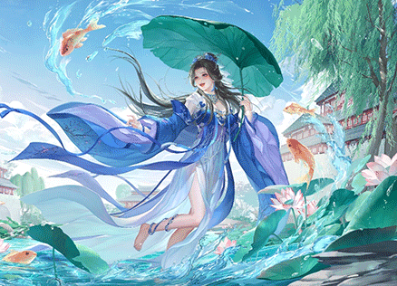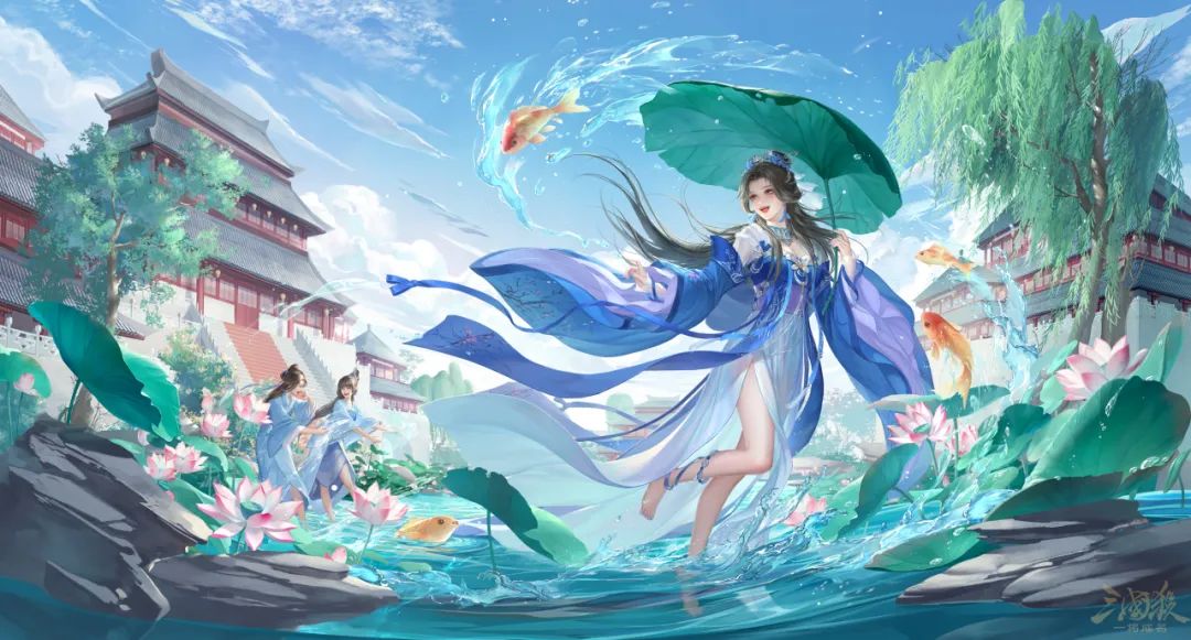 曹宪身着轻纱罗裙,赤足踏入池塘。水珠顺着白玉般的脚踝滑落,惊起一群锦鲤。它们摆尾游走,跃出水面,引得曹宪娇笑连连。