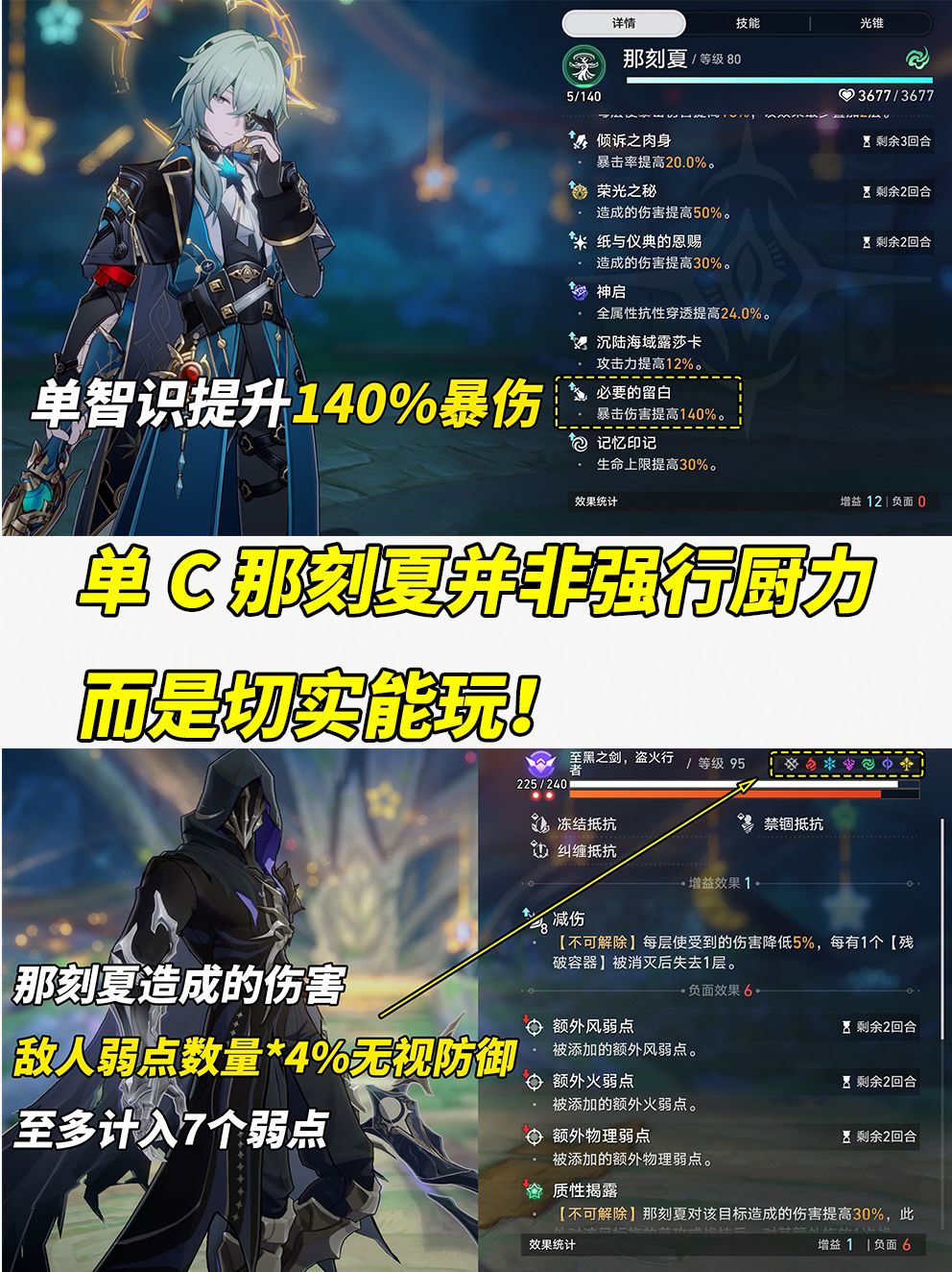 击破流那刻夏对环境要求较高,因此在讨论单C玩法时,主要还是考虑直伤双暴体系。看似副C定位的那刻夏,其身上主C特性有多少呢?