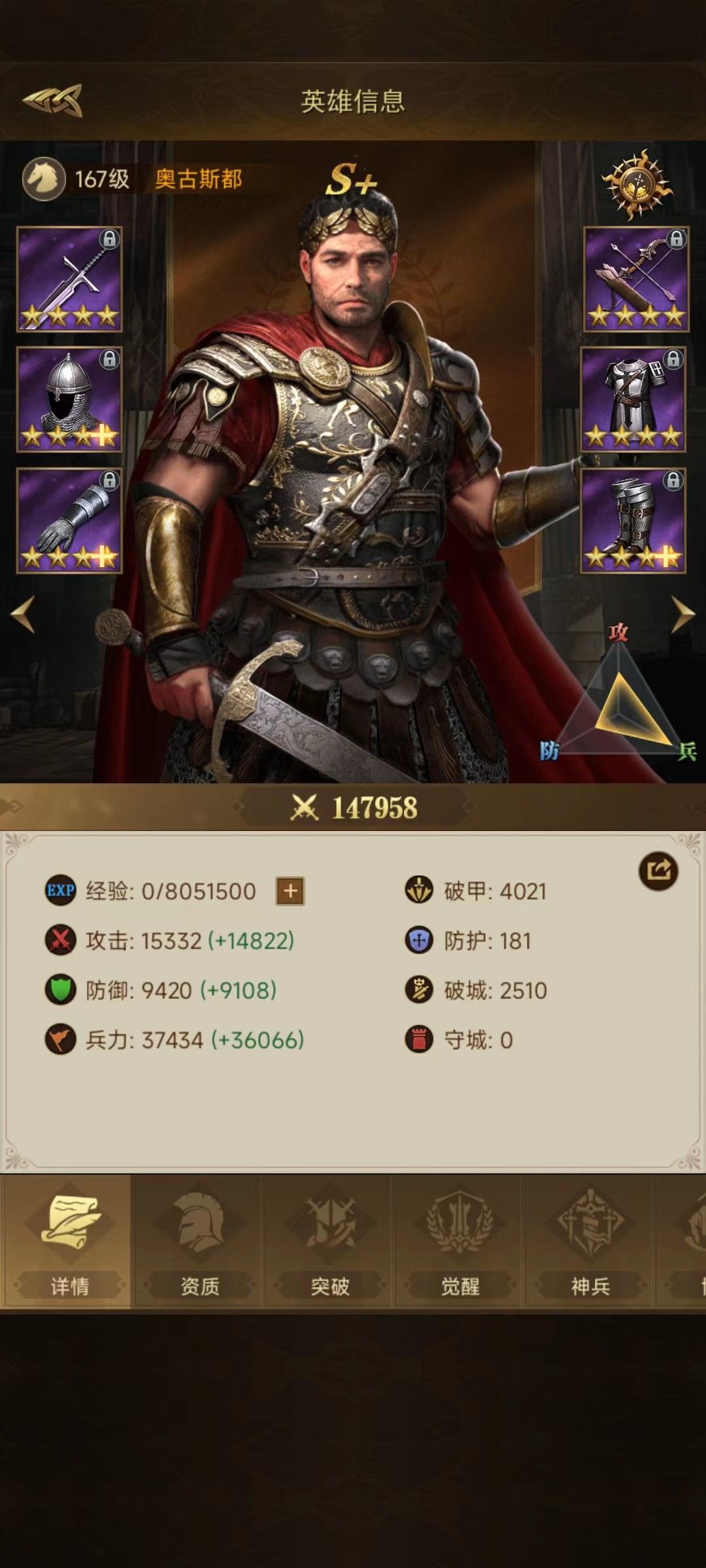 2张战报奥古斯都的破甲都是4000左右,造成的伤害一个是9167,1个是10934,差别为1767。通过对比发现,使用的兵书有所不同,造成伤害多的奥古斯都使用的兵书有暴击4%的加成。