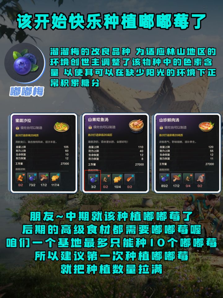 朋友~中期就该种植嘟嘟莓了,后期的高级食材都需要嘟嘟莓喔~没有嘟嘟莓不自由,那你就得跑断腿咯~
