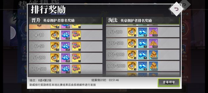 然后就是投票排行奖励,两边都有一个榜,所以我们可以两边都投票,大部分道具最好是跟结社成员投同一边,因为这边都是获胜方,排行榜奖励更多,尽可能在胜利方拿个前两百,正常刷活动本用道具应该不难达到,这样可以拿15金芯。失败一方就随便了,用一个绿色何首乌就够了,这边只要投了就有5金芯,而且要前50才会有更多金芯,普通玩家没必要冲这个榜,这样每场比赛能拿20金芯+两三百钻+1随机SSR装备+1爪子+1普池+1甄选,总共有七场比赛,总共加起来奖励还是很多的,足够去伙伴商店换下这次的叶菲和绷带了。