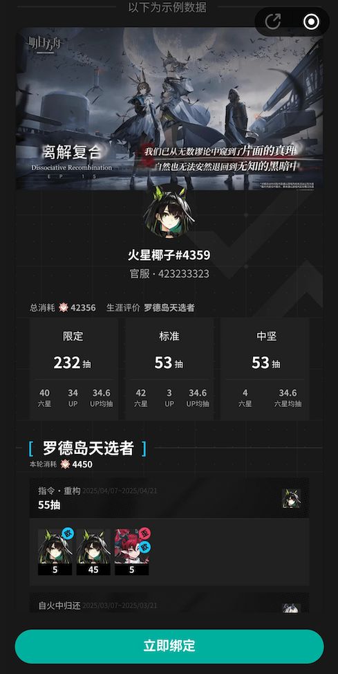 【使用指南】- 进入工具页面,点击「立即绑定」按钮,前往明日方舟官网登录,完成后即可自动获取您的近90日内抽卡记录