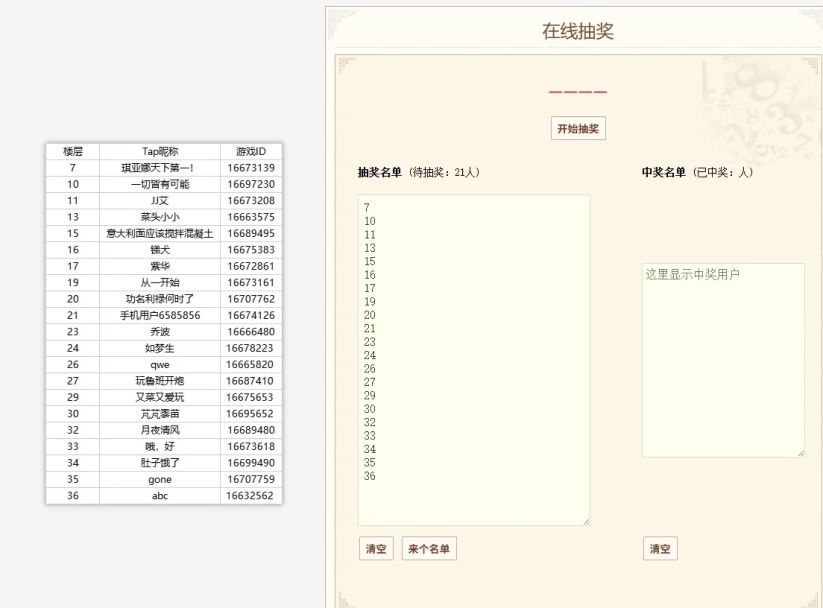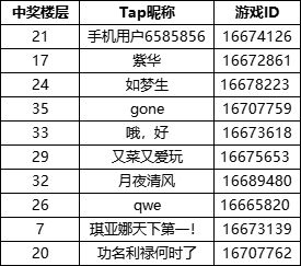 恭喜以下欧皇!请在[7]个工作日内,关注官方账号 @白貂,并添加其官方QQ号 @白貂(3812290556)为好友,私信核对【TapID】信息以及游戏【角色ID】,核实后将在[3]个工作日内为大家发放奖励哦~