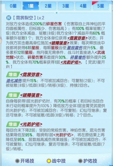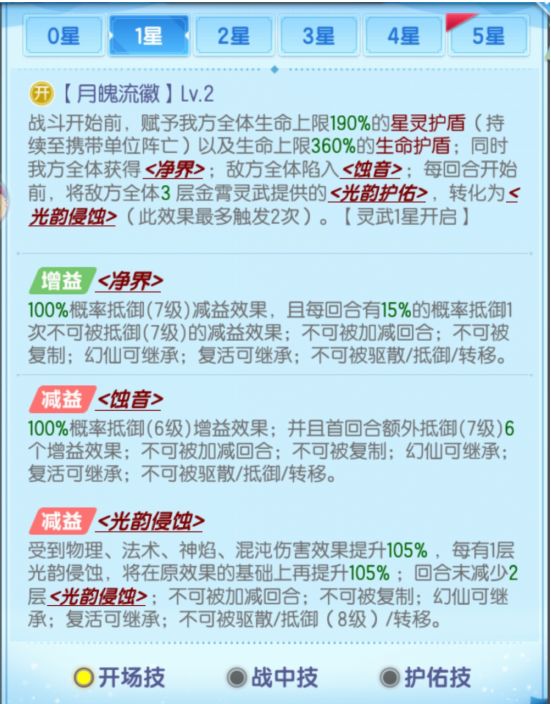 开场技:仅出战灵武生效,庇佑灵武不生效,在战斗刚开始生效,整场战斗一次