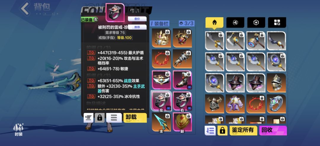 另外 教大家一个低价打追忆的方法 追忆随机词条我们选择 技能范围 格挡率 暴击伤害 暴击值 只要打出这些都可以 大家打的时候 先把第二条都换成不需要的词条 然后就疯狂敲第一条 直到敲出第一条t0的词条 这样成本会低非常多 因为这样敲第一条的时候需要的词条出现概率就非常非常高 请务必敲到t0再换下一个