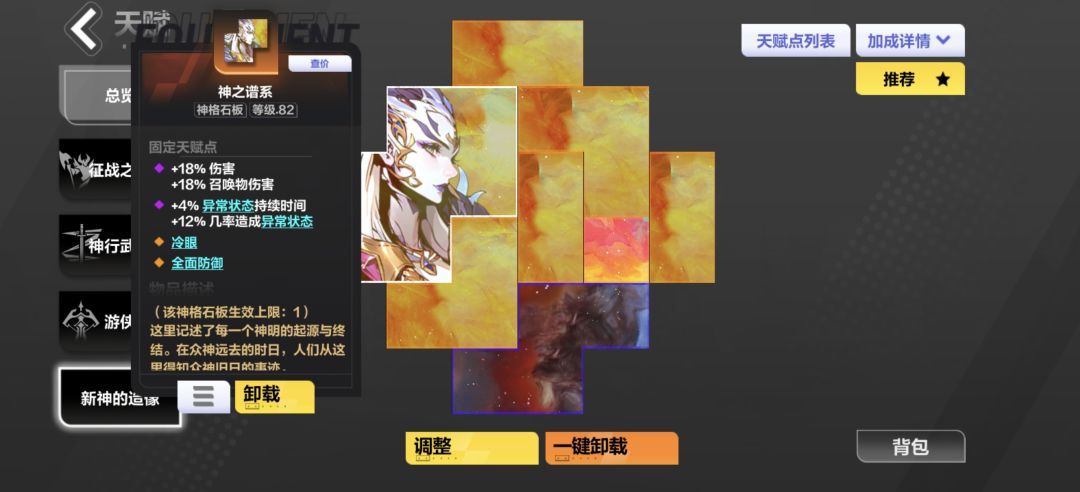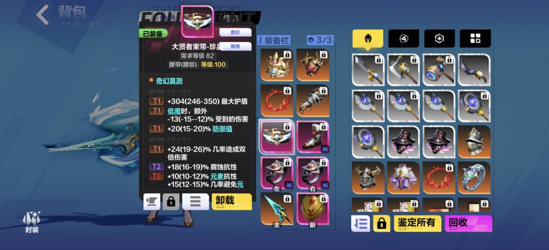 调香了奇幻莫测的腰带 测了很久 奇幻莫测是最合适性价比最高的 记得石板上找一个攻击和法术附加点伤的板子 这样才能触发异常状态 腰带我没怎么弄 一是腰带上的东西确实一般 只能找找生存 二来也是可以换成永恒腰带杀的更爽 所以就没必要弄太好了 弄t1就够了 别弄太好
