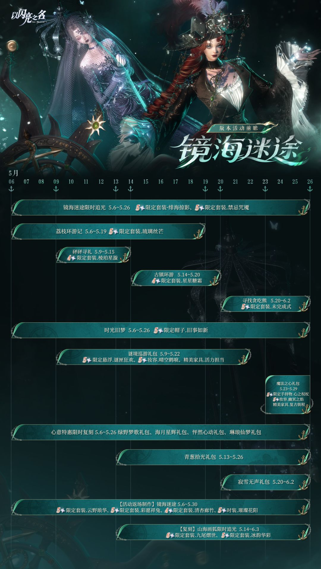 5月6日更新后,限定追光活动【镜海迷途】上线!全新五星套装及SR羁绊限时登场!该追光活动每登场10次内必获得SR羁绊或限定五星套装部件(直至集齐所有限定五星套装)。集齐限定五星套装•绯海掠影可激活专属出场动作【夜海征伐】,集齐限定五星套装•禁忌咒魇可激活专属出场动作【长夜缠绵】,并可在拍照-动态动作里使用。