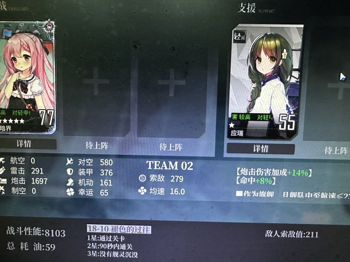 如果算上支援舰,你最多只被允许增加(0.27x59=15.93)点油耗。否则单从经验收益的性价比角度来考虑,每一滴多出来的油都是亏损——而且这还没算上你高油耗下减少捞船次数后,带来的捞船奖励的减少幅度(原本59油耗能捞69把的油,队伍二只能捞59把,如②里所说,其他捞船奖励会减少14.5%)。