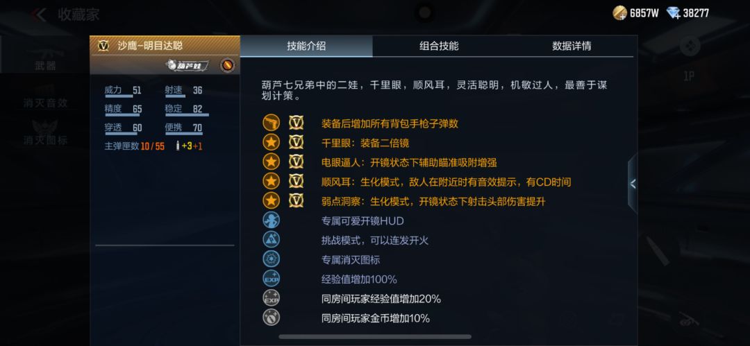 外观上武器是以葫芦娃二娃为原型,它的远程攻击属性恰恰对应了它的千里眼特性,并且在局内还可以开启二倍镜,同时这款武器在生化模式中拥有好几个强化属性,大大的提升了其综合性能。