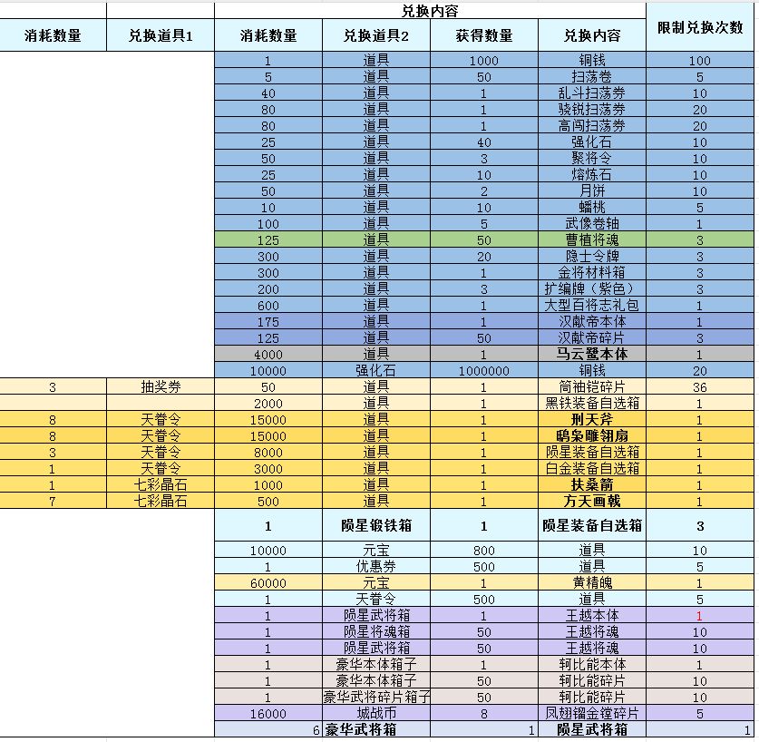 在兑换界面,主公大人们可以用“千榫锁”道具兑换 扫荡券、熔炼石、聚将令等武将养成必备养成资源!