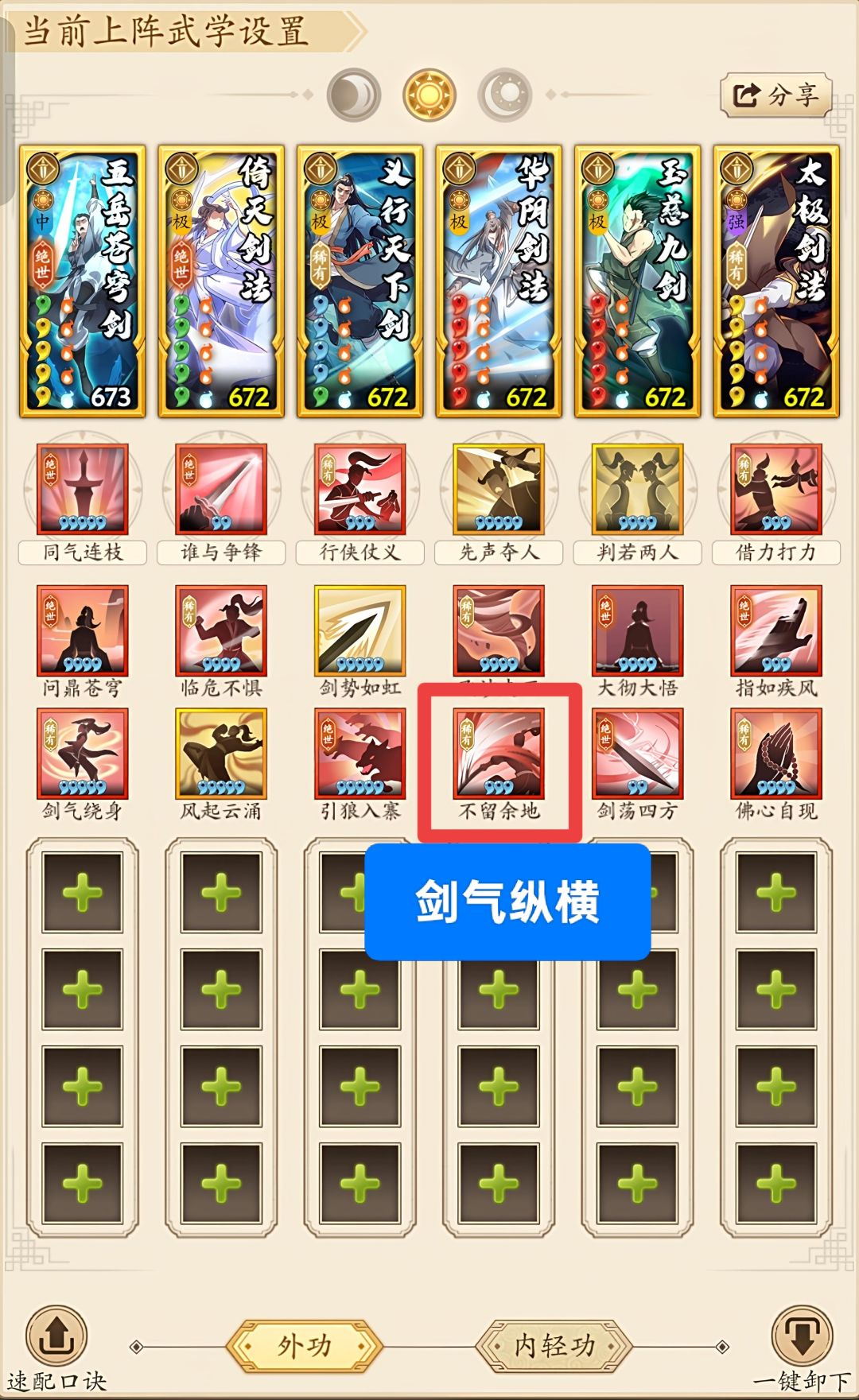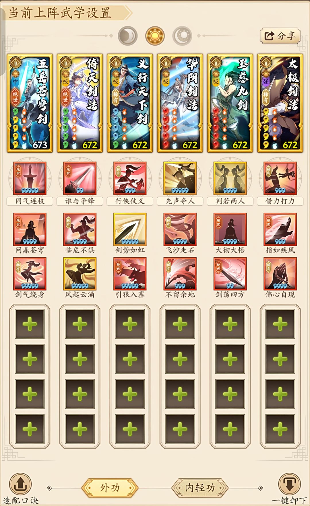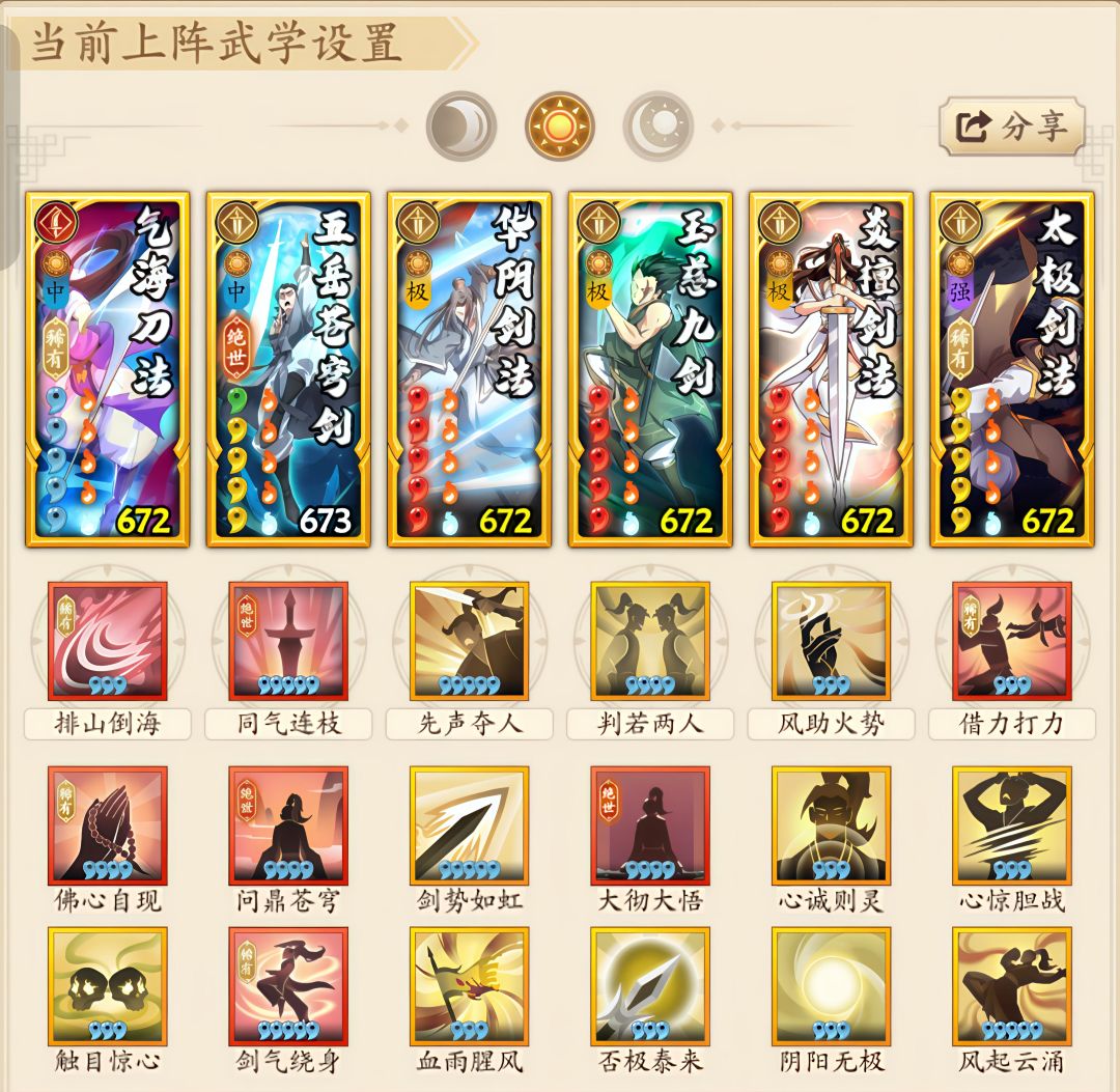 武学:玉慈九剑,内轻:魅影神行,稀有:神行留香,绝世:五岳苍穹剑/倚天剑法
