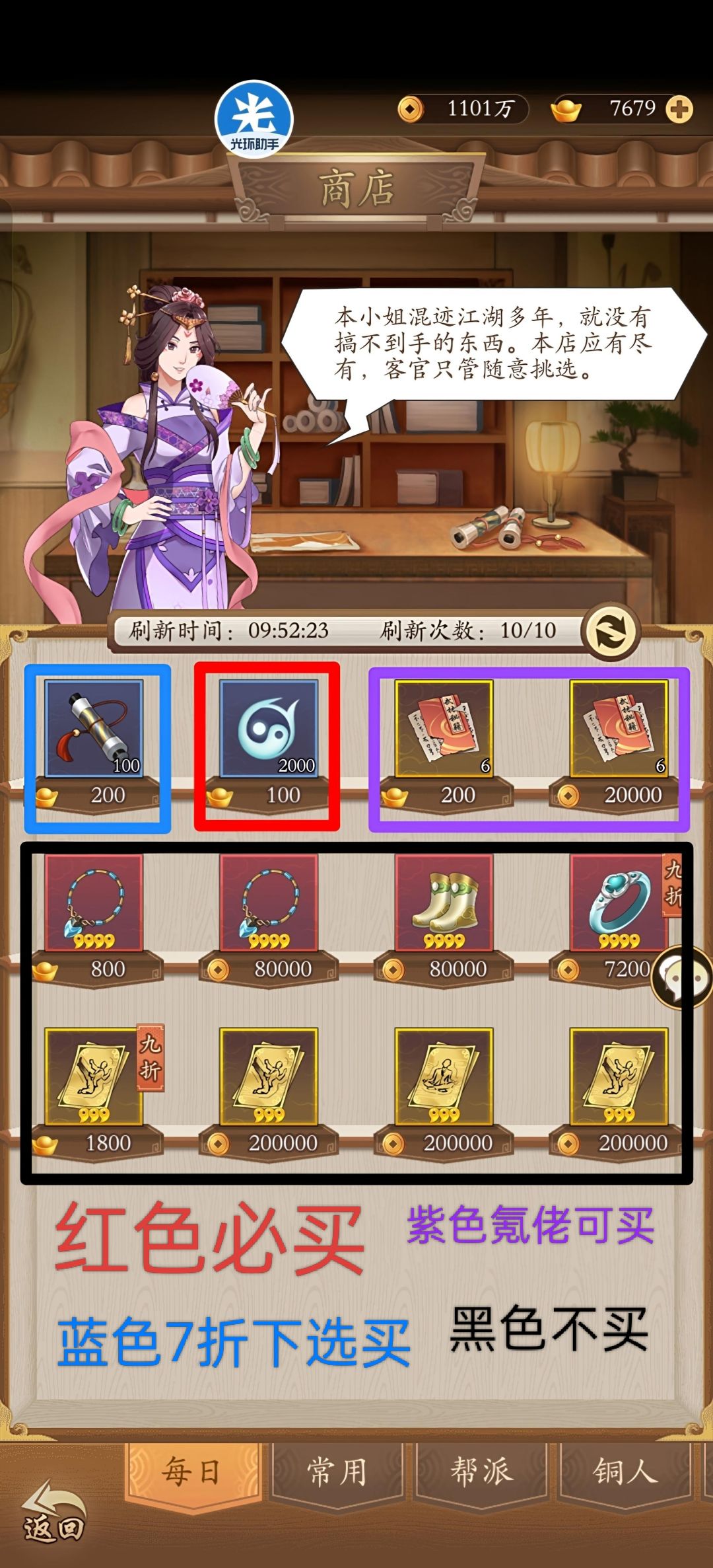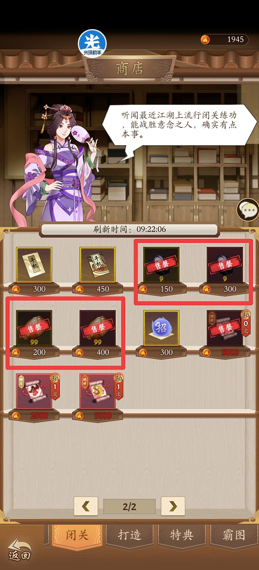 闭关商店兑换打造石头,不氪金唯一打造装备的兑换途径,必优先兑换石头,“祥龙”招式可在剩余闭关点多的情况下兑换爬塔用,其余两个招式可不换