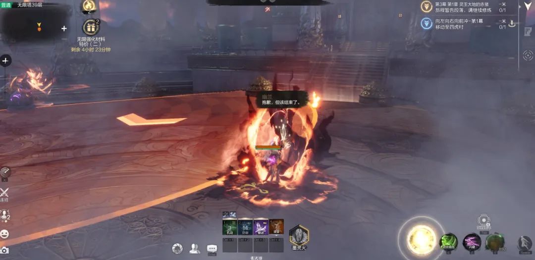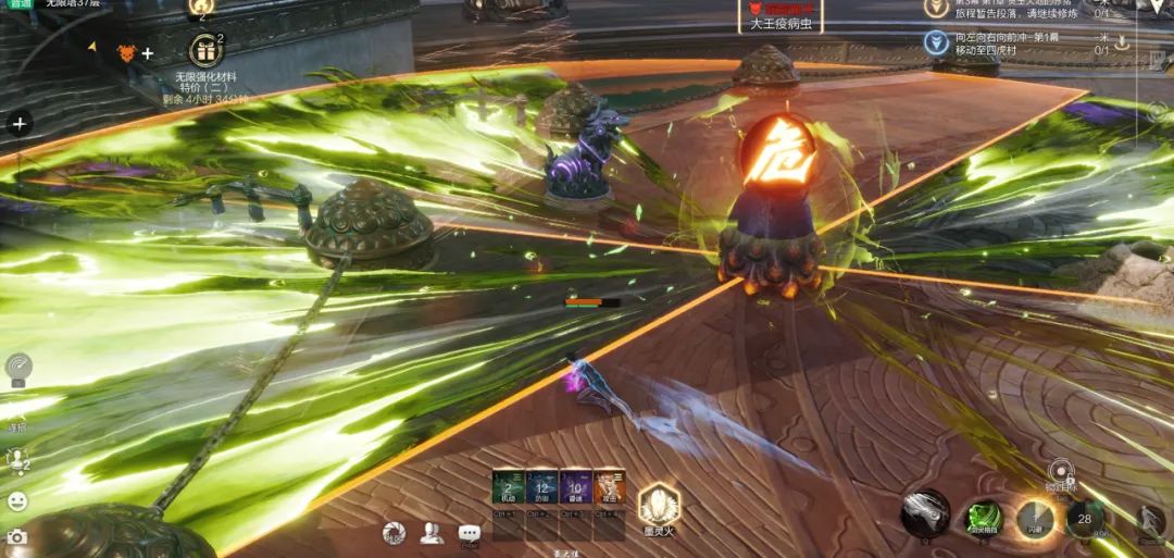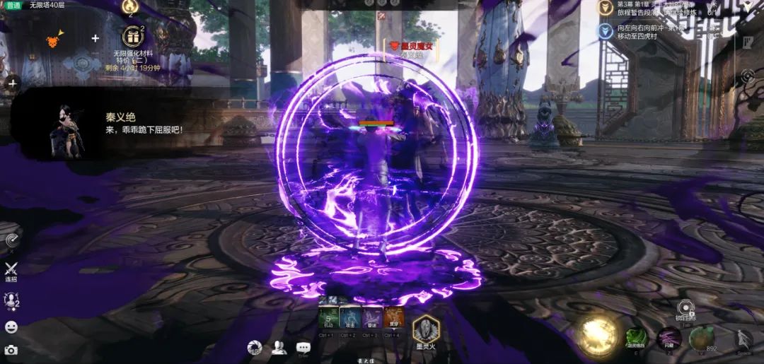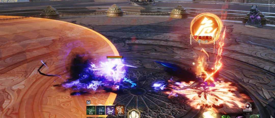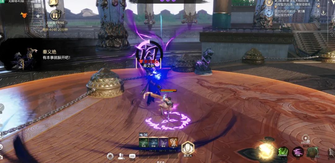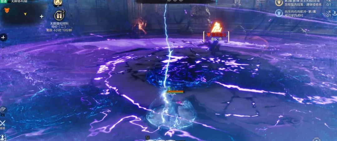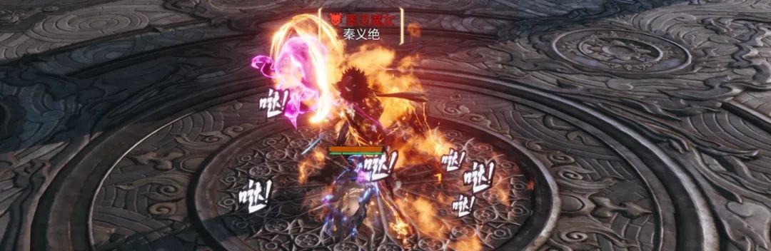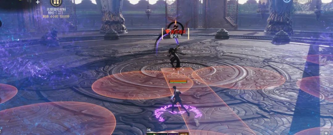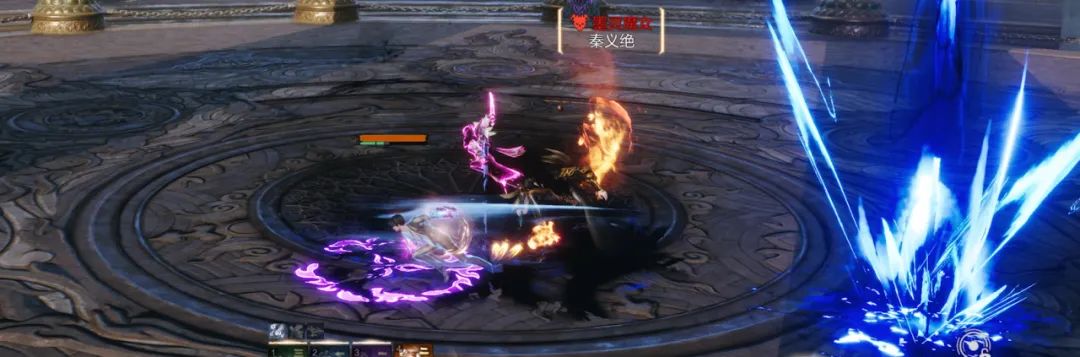 特殊阶段:秦义绝回到场地中央,玩家被拉回,先是一波顺劈(走位躲避),然后出现“危”提示时,与师傅站在一起寻求庇护,师傅会击倒秦义绝,此时可集中输出 。