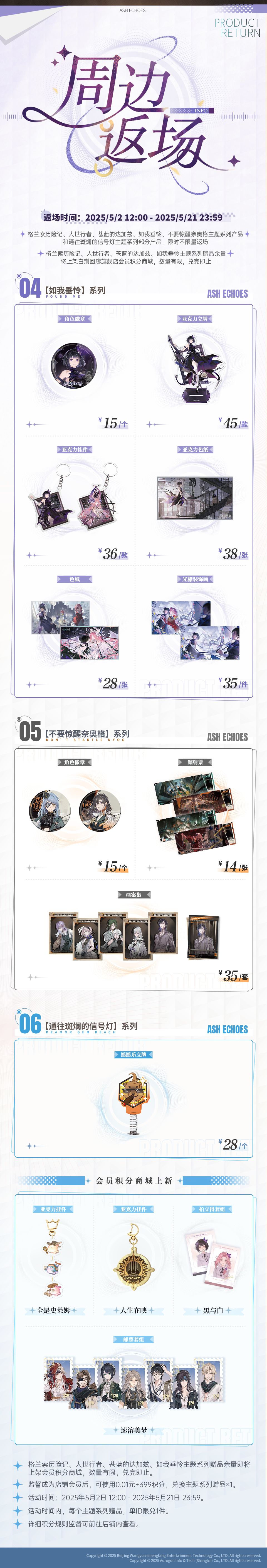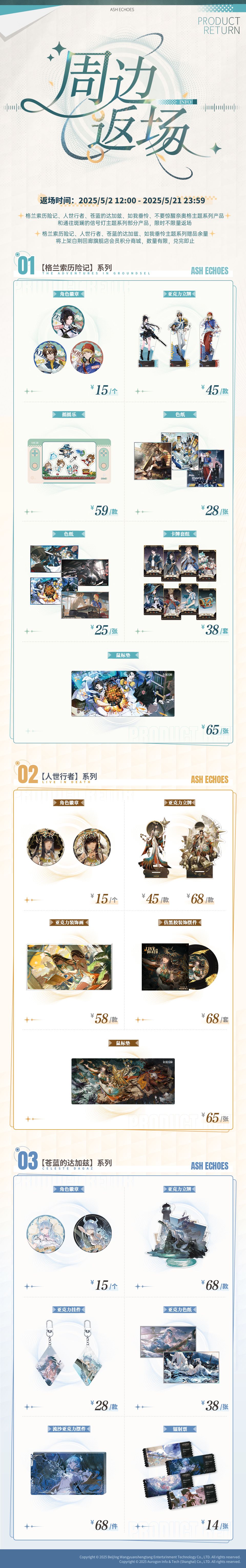 ※格兰索历险记、人世行者、苍蓝的达加兹、如我垂怜、不要惊醒奈奥格主题系列产品和通往斑斓的信号灯主题系列部分产品,限时不限量返场。