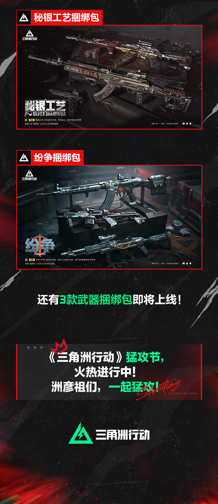 活动二:【彦祖送三角券】5月1日~5月8日,完成烽火累计带出收益任务或全面战场的得分挑战送【3个限时三角券补给包】和鱼子酱红运当头补给包、军功倍增卡等奖励!