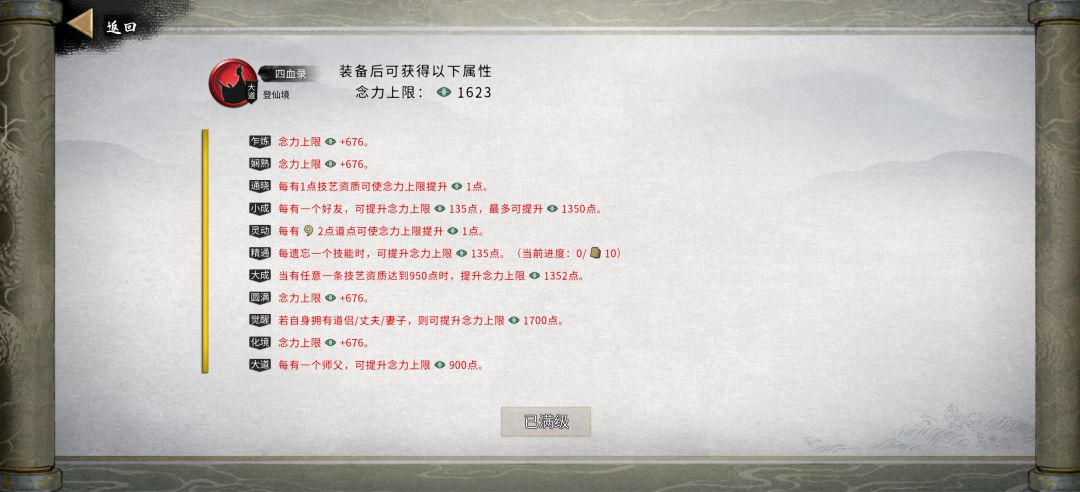 1.念力心法词条我发在上面,需要注意的是拜师,拜师我建议不要等到登仙期去拜师,因为只能拜比你境界高的,建议羽化期拜足够多的师傅,随便送几个红心法,拜普通npc就行。