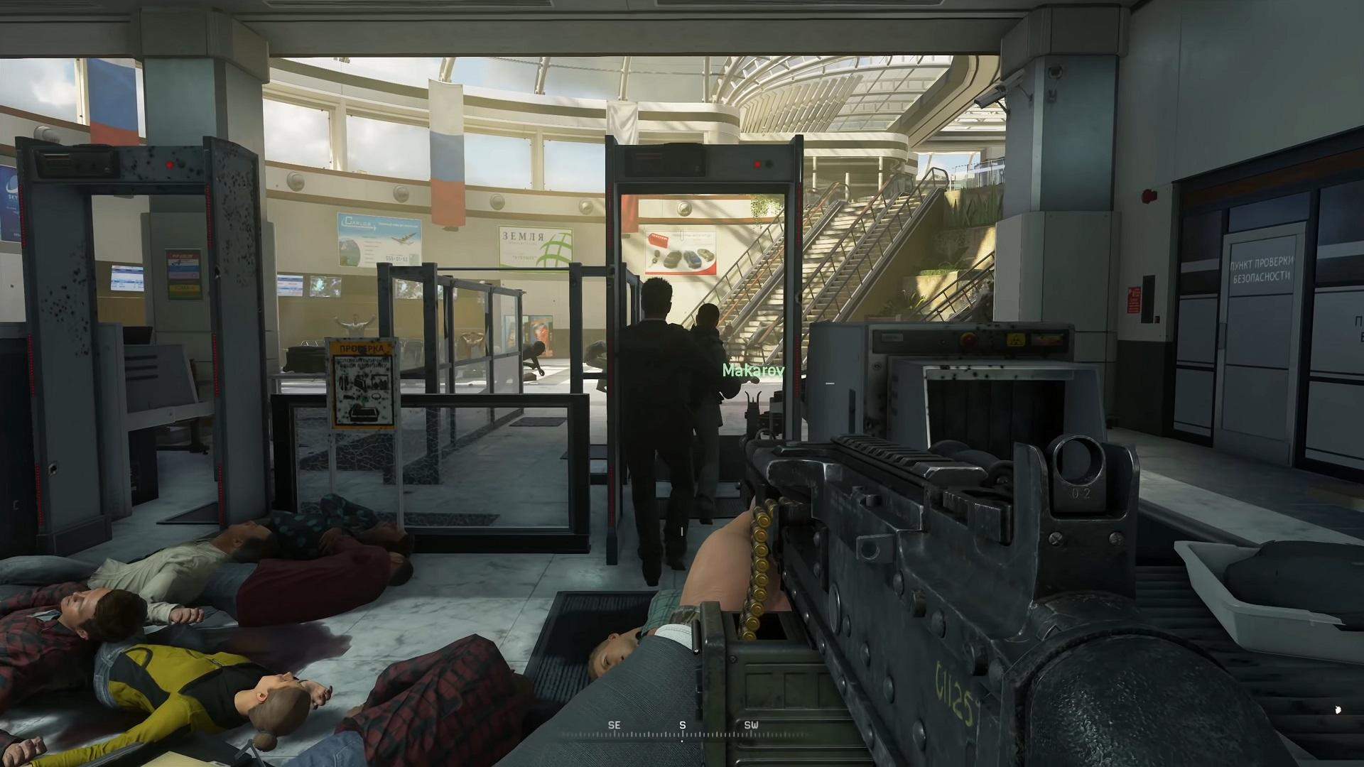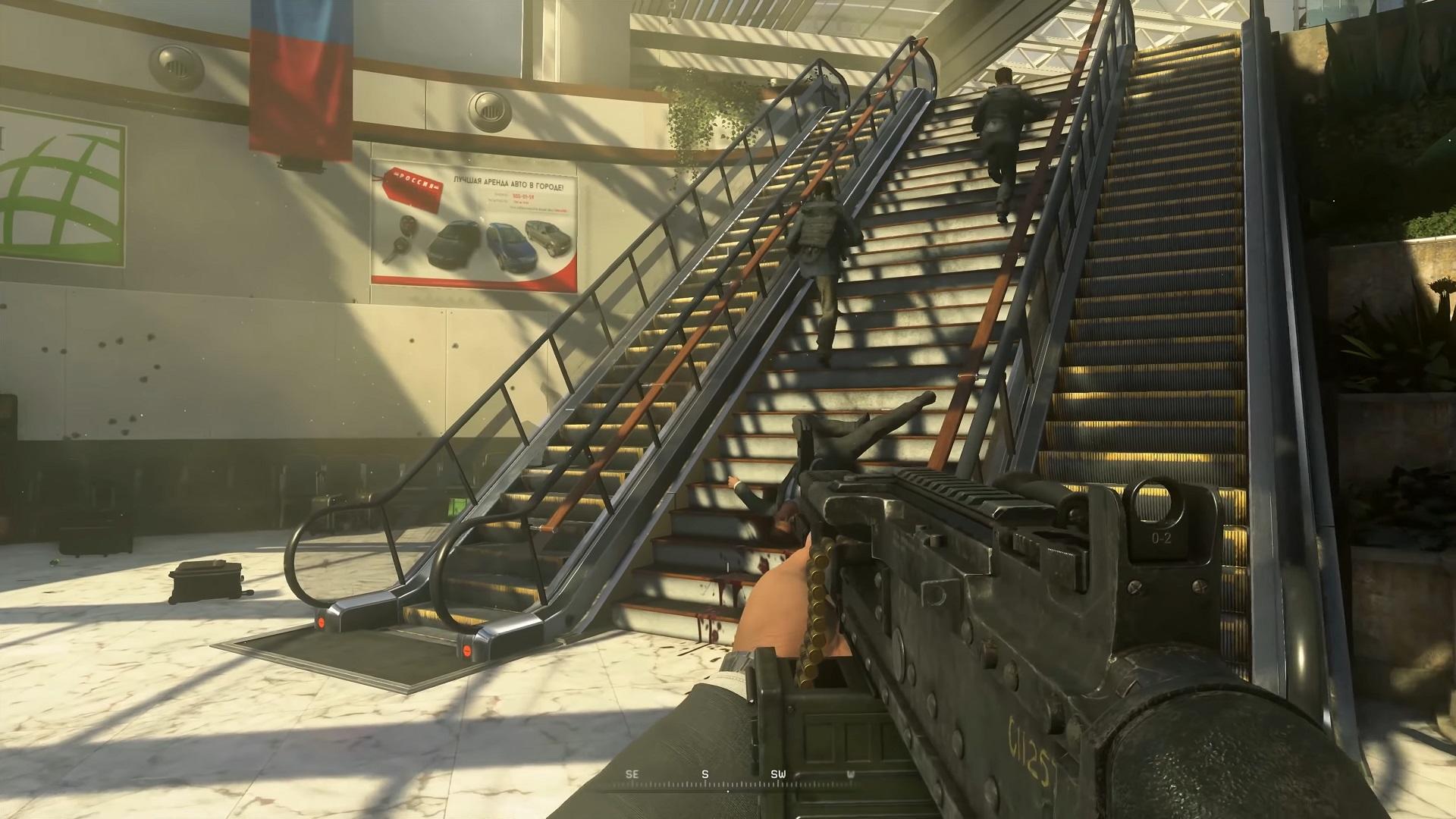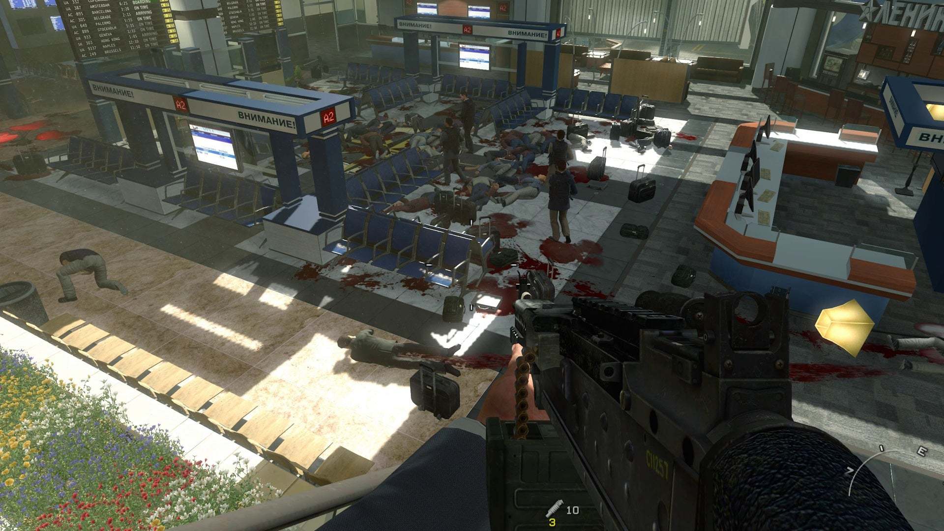 由于没有任务前的简报,枪口抬起的那一刹那让人感到心如刀绞:你知道会很糟糕,但没想到会这么糟糕。但是这还不算完,接下来,马卡洛夫和他的手下们又沿着候机厅继续屠杀,向逃跑和投降的平民开火。他们沿着楼梯爬上了购物区,继续随意射击。接下来,这一幕还在不断继续上演……这是一场以数码呈现的活生生的噩梦。