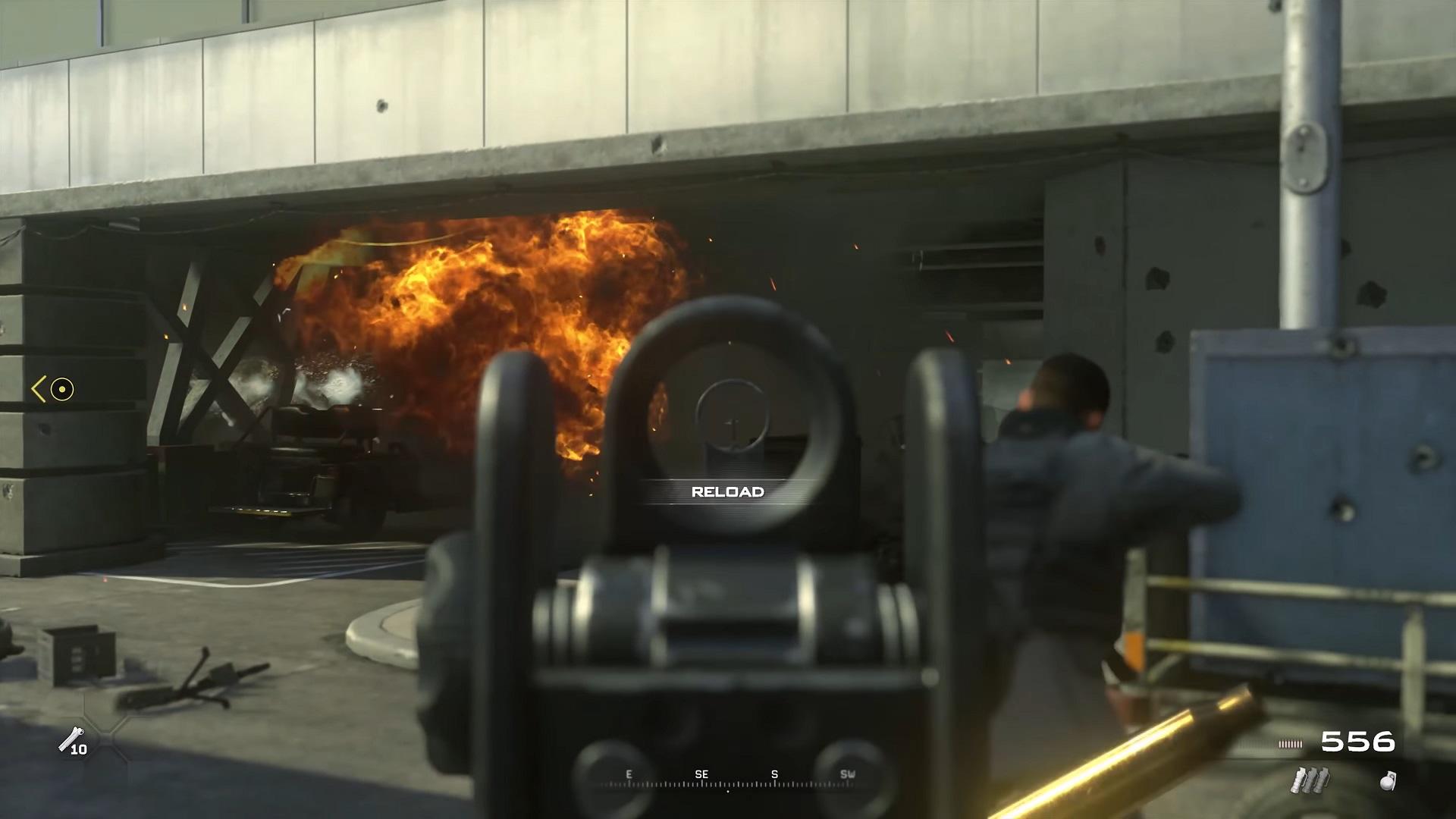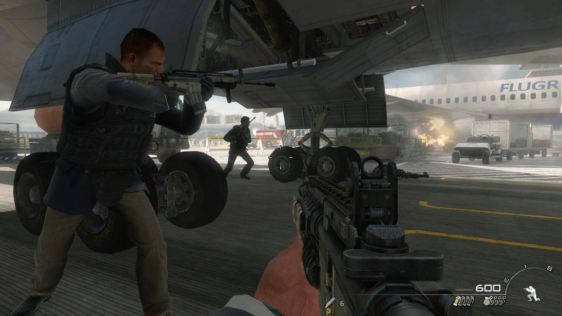 在进入战斗为主的后半部分后,这群人从闲庭信步的屠杀者转变成了方·基默扮演的角色。到了停机坪后,关卡设计重新遵循了「使命召唤」的经典原则。行李推车、飞机轮胎、混凝土建筑支架提供了不同程度的掩体。巨型客机遮挡了场景,也掩盖了未来的威胁。敌人在地面推进、包抄,他们的盟友在二楼的窗口射击,迫使玩家评估自己的目标并寻找合适的射击位置。整个场景都按脚本进行,中间穿插着爆炸,让气氛像电影大片一样高度紧张。
