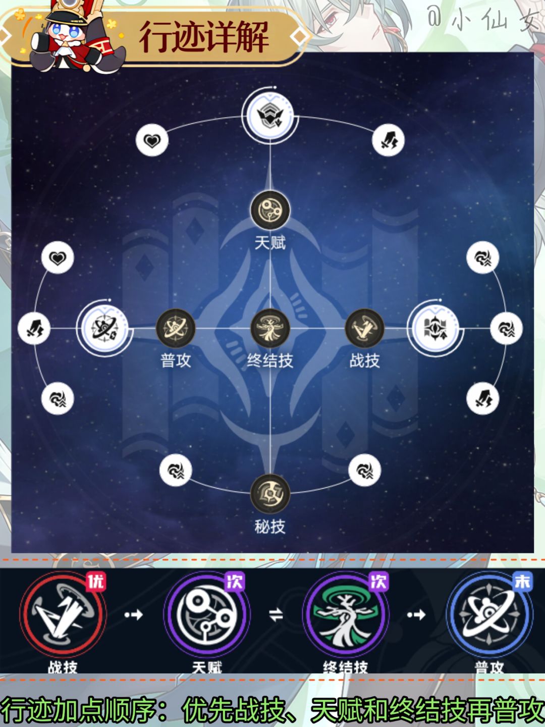 通过天赋在击中敌方时额外添加随机弱点,超过5个弱点时会自动施放1次战技,还可以通过终结技一次性给敌方全体添加全部 7种弱点,整体上在造成伤害之外还拥有一定的光环&辅助功能。