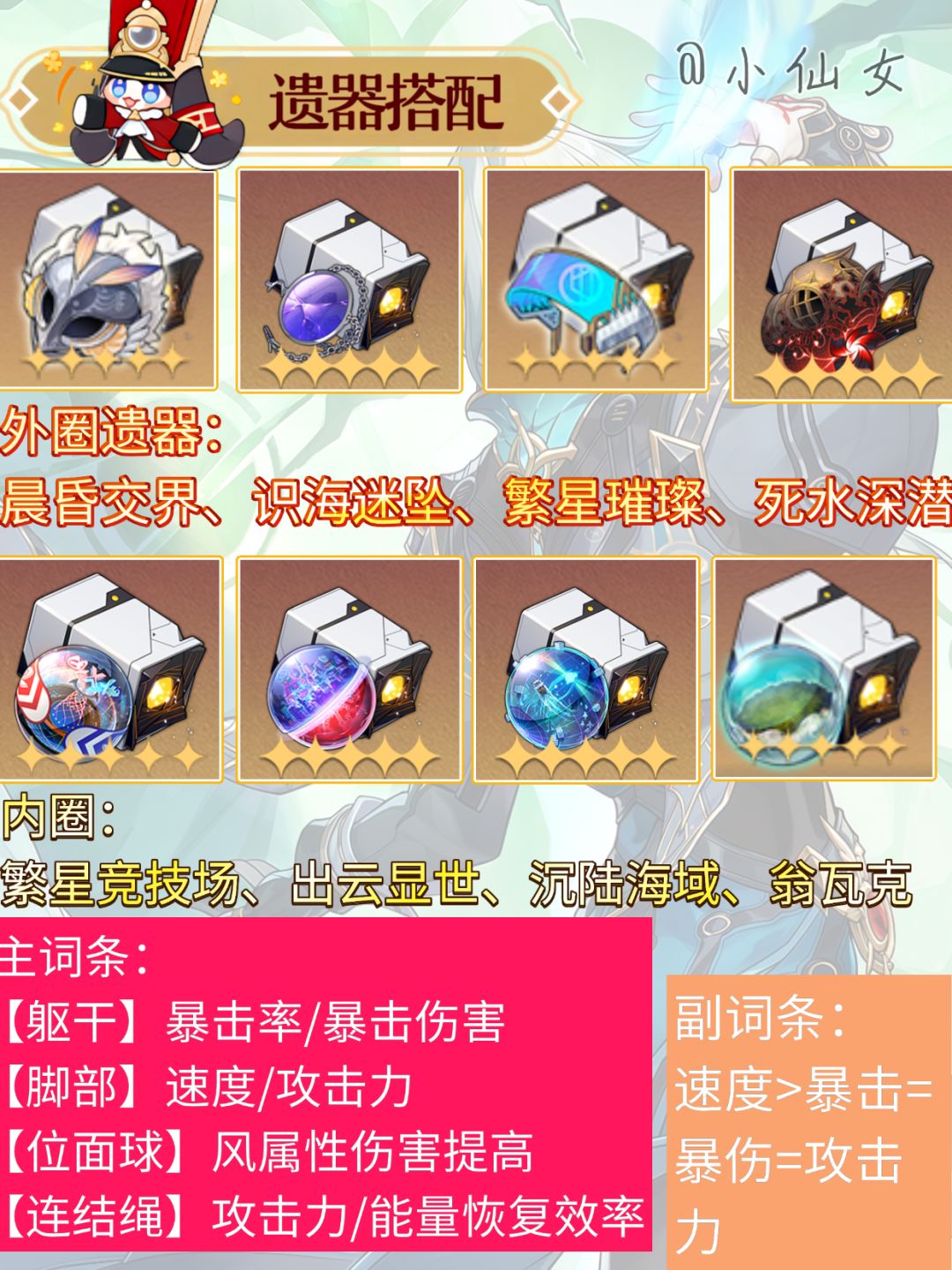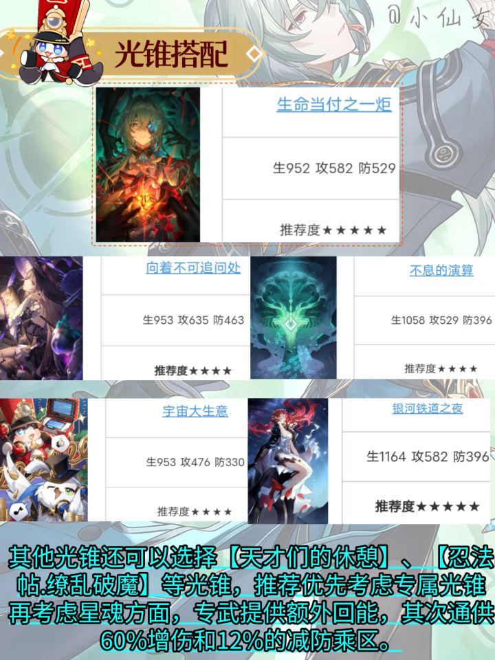 <那刻夏>最大的特点就是可以进行全弱点添加,并且数值方面也基本能跟上3.X版本,可以说是一名同时具有功能性&输出能力的智识角色,配队配装思路多样,“智识副C/泛用副C/直伤主C/超击破主C”都能尝试;