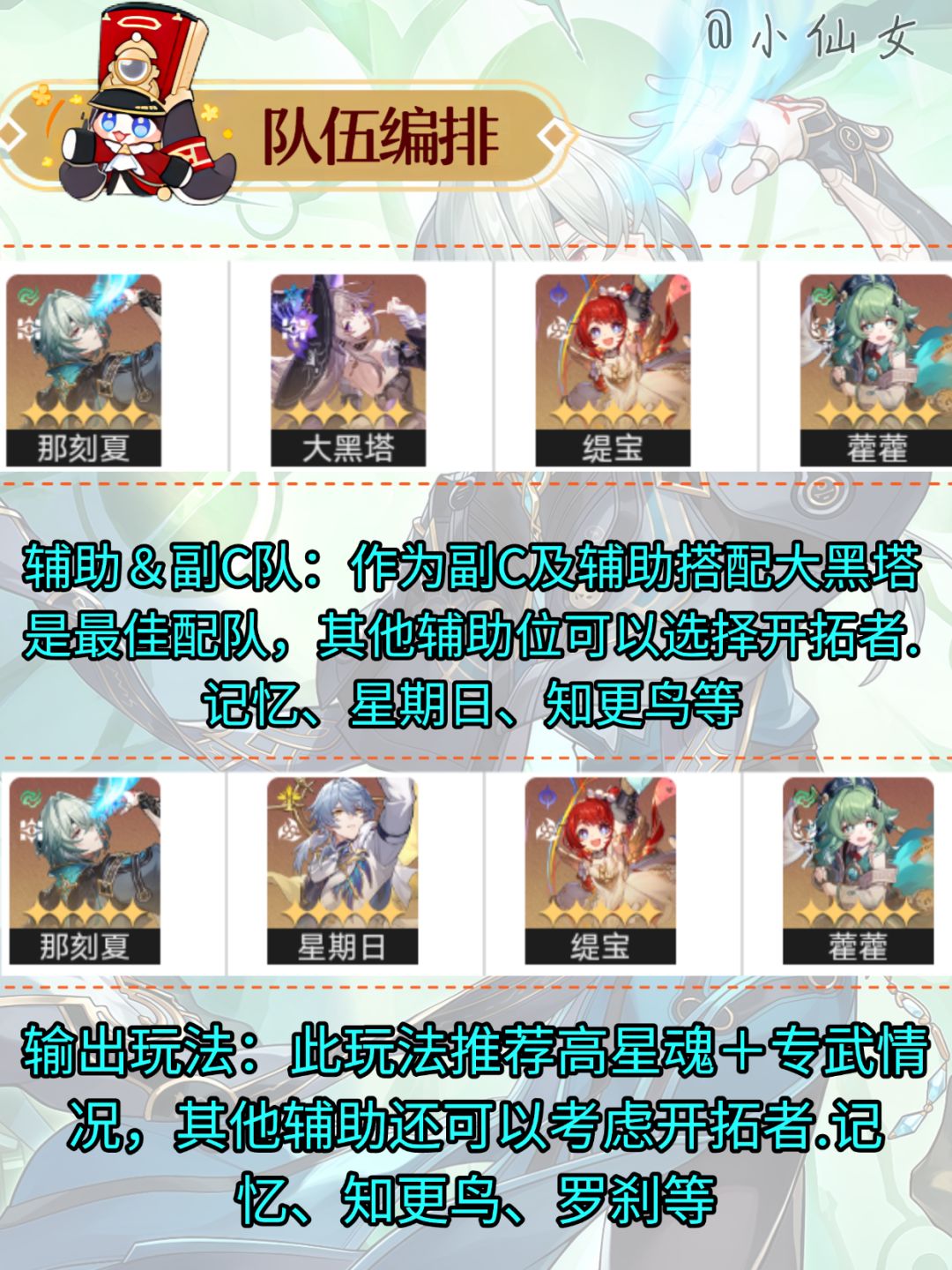 ①作为[智识命途]的角色,首先就需要考虑<大黑塔>队伍,<那刻夏>可以提供"对群手段+光环互拐+自身输出"多种效果,毫无疑问可以成为<大黑塔>性价比不错的"售后"队友!