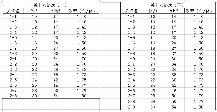 本活动各关卡收益详见下图右侧的表格。