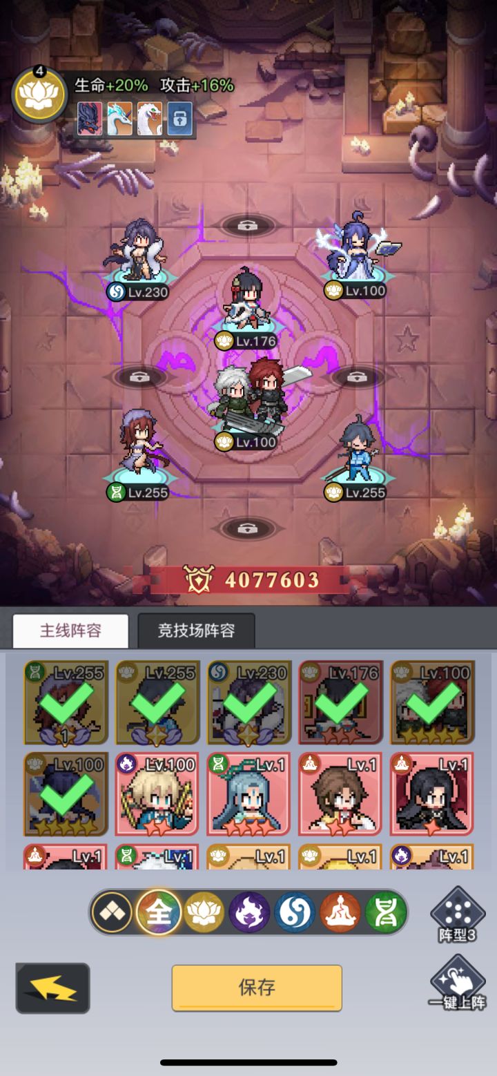 本人平民爬塔(武斗空间)阵容,主C:白跟洛兰,雅雅范围输出+控制,小飞放中排叠buff+复活,依依带奉献,死了加攻击,白月初带红法器九龙,物连还有其他加攻击伤害的符箓,战力4百万,爬塔403层,只适合爬塔,不适合打架!