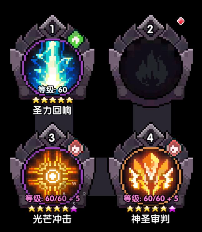 上面三个技能是必需携带的技能,其中神圣审判和圣力回响无等级要求,光芒冲击满级